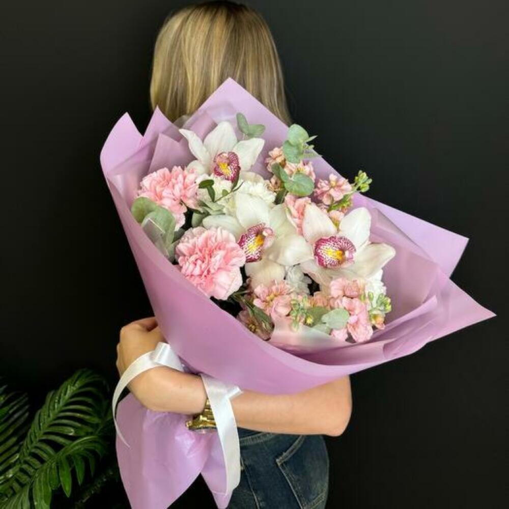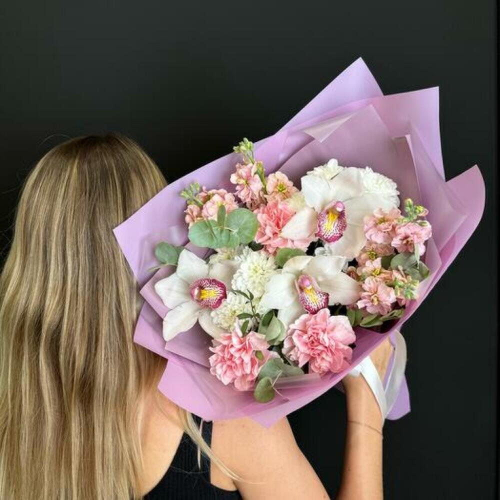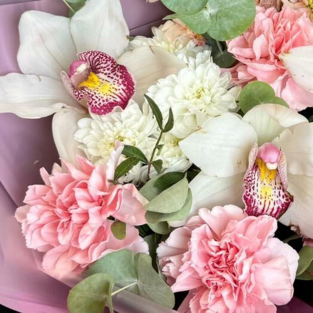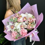 Disfruta de la delicada belleza de nuestro ramo, donde elegantes orquídeas blancas se encuentran con el suave encanto de los alhelíes rosados y los claveles. Las orquídeas puras y gráciles simbolizan el lujo y el refinamiento, mientras que los tonos rosados de los alhelíes y los claveles añaden un toque romántico y tierno. Este ramo es perfecto para celebrar el amor, la belleza o cualquier ocasión especial que requiera un gesto sofisticado y sincero. La armoniosa combinación de flores blancas y rosadas crea un ramo tan cautivador como elegante, dejando una impresión duradera de elegancia.
