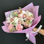 El crisantemo - 2 ud. Pistachio - 2 ud. dianthus - 3 ud. orchid cymbidium - 3 ud. matthiola - 2 ud. ribbon satin - 1 ud. eucalipto - 2 ud. designer wrapping - 1 ud.