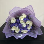 Sumérgete en la exquisita belleza de este especial del florista, una mezcla delicadamente elaborada de 11 rosas blancas inmaculadas armoniosamente combinadas con 10 vibrantes rosas moradas. El contraste llamativo se embellece además con 5 ramitas de limonium morado, añadiendo un toque encantador a este conjunto estéticamente atractivo. Verdaderamente un espectáculo para la vista, este ramo se convierte en un gesto memorable que expresa tanto elegancia como encanto.