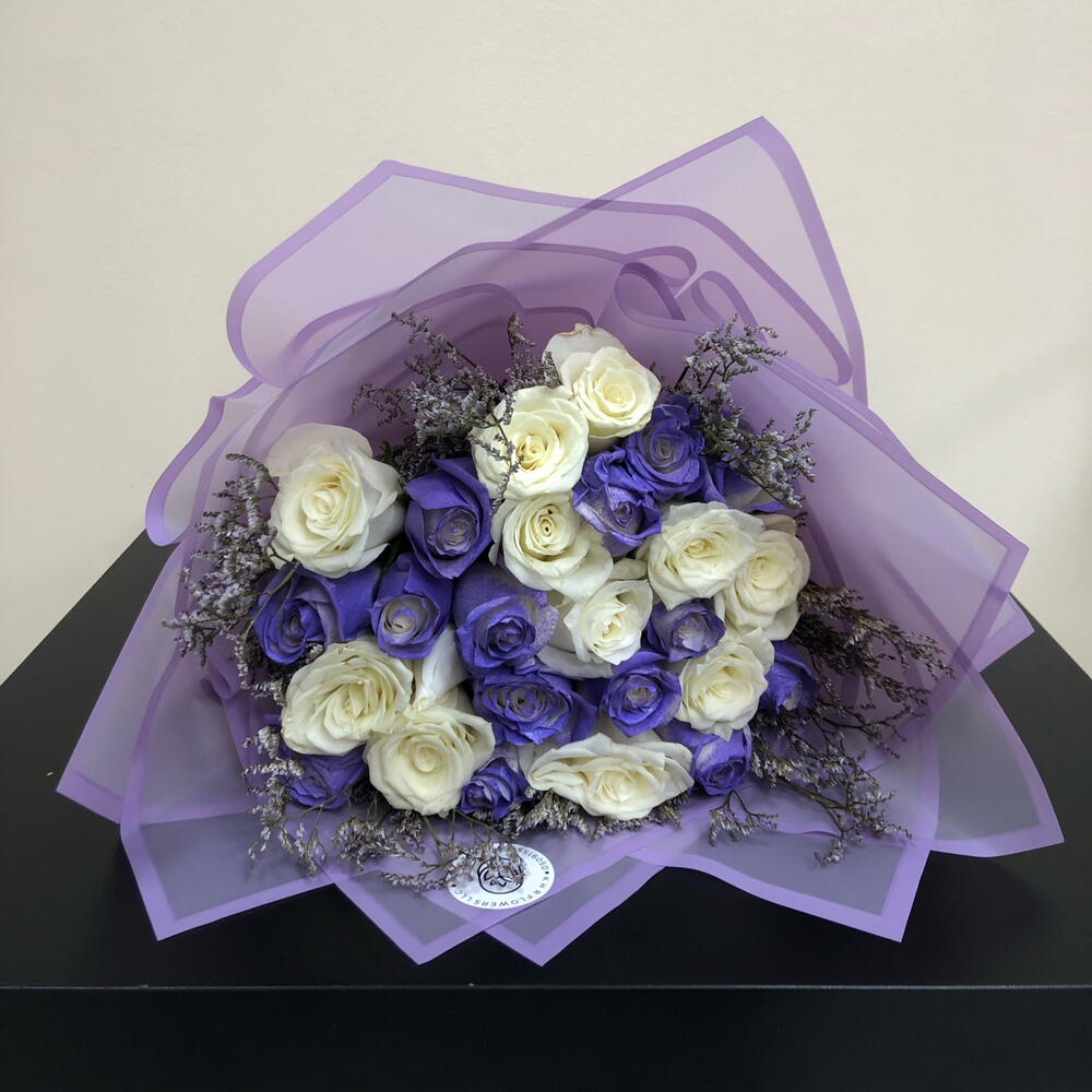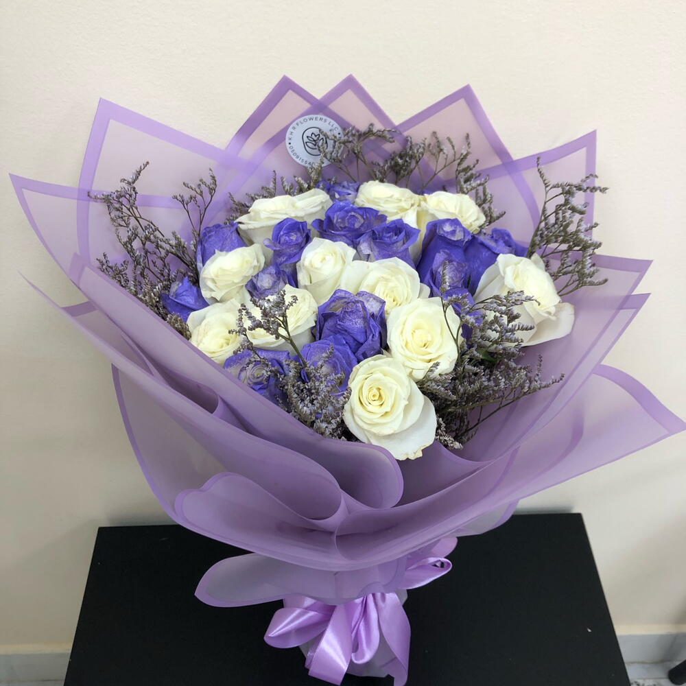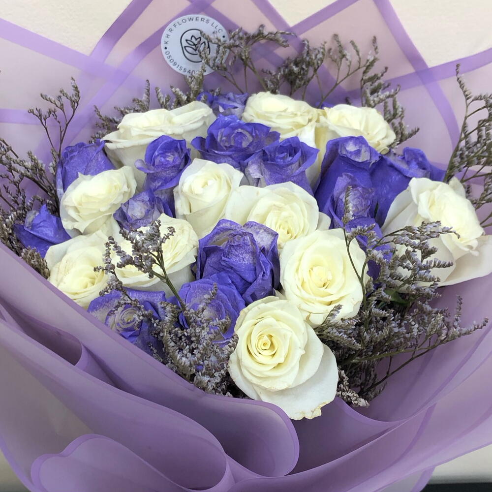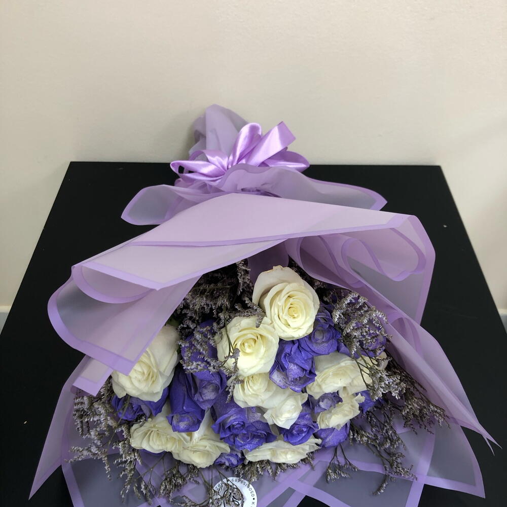 Sumérgete en la exquisita belleza de este especial del florista, una mezcla delicadamente elaborada de 11 rosas blancas inmaculadas armoniosamente combinadas con 10 vibrantes rosas moradas. El contraste llamativo se embellece además con 5 ramitas de limonium morado, añadiendo un toque encantador a este conjunto estéticamente atractivo. Verdaderamente un espectáculo para la vista, este ramo se convierte en un gesto memorable que expresa tanto elegancia como encanto.