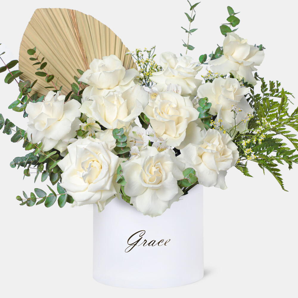 Greenery - 5 ud. Limonium - 2 ud. Alstroemeria - 3 ud. palm spear - 1 ud. rosas blancas - 11 ud.