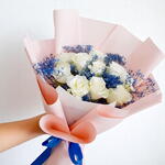 White Rose Bouquet with Blue Gypsophila - Elegant Floral Arrangement
