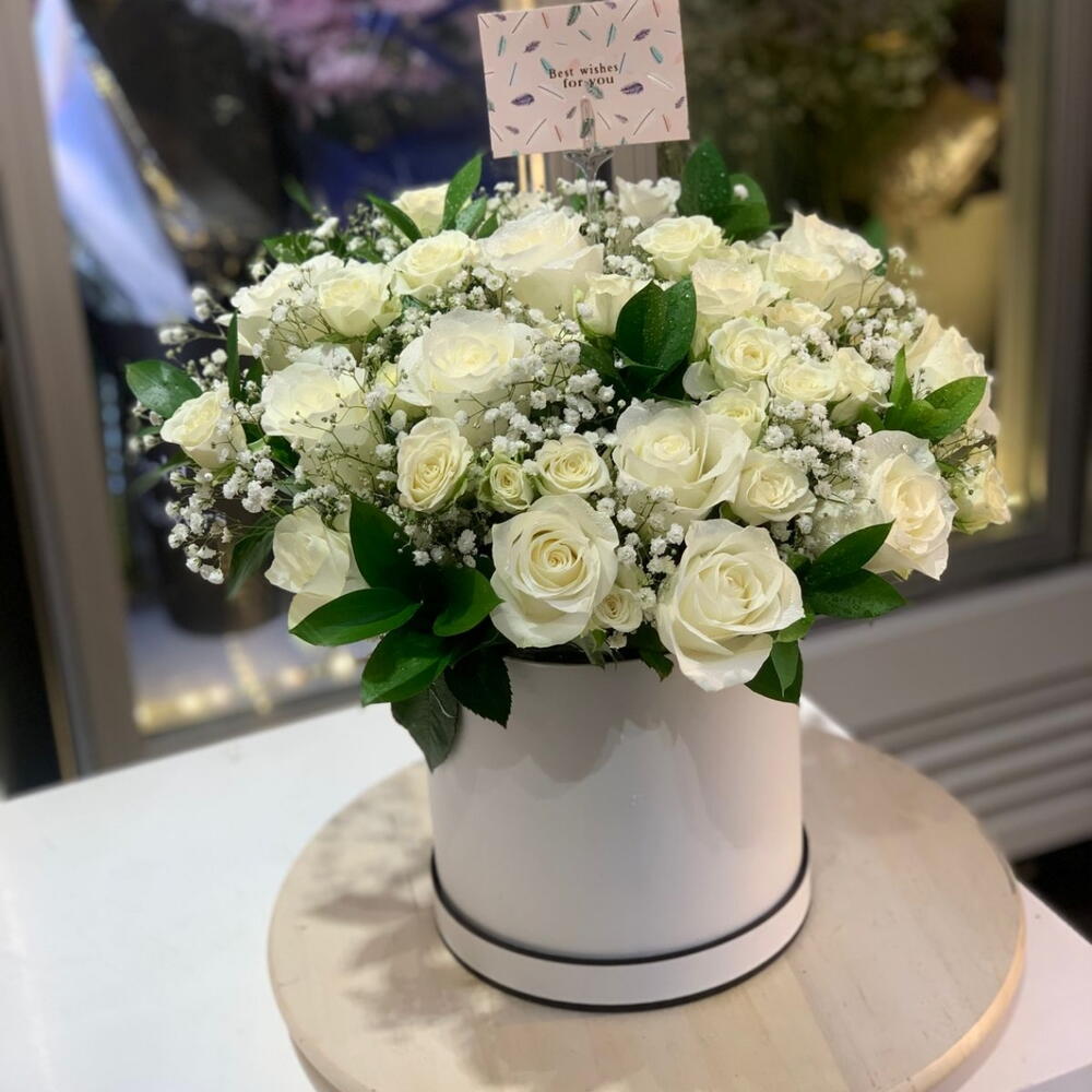 Gracioso y atemporal, este elegante arreglo de rosas blanco cremoso se combina con delicadas flores de gisálida y exuberante vegetación para crear una presentación serena y sofisticada. Su paleta suave y neutra transmite pureza, recuerdo y sinceridad, ideal tanto para momentos de alegría como de reflexión. Para mantener el arreglo fresco, añada agua a la espuma floral dentro de la caja cada 1 o 2 días y guárdelo en un lugar fresco y a la sombra. Con el cuidado adecuado, estas flores conservarán su encanto y elegancia durante 5 a 7 días. Ideal para momentos especiales como cumpleaños, aniversarios o cualquier ocasión especial, este ramo de flores trasciende lo común y se convierte en una manifestación tangible de amor. Envíelo como regalo de cumpleaños, para expresar deseos de aniversario, para desear una pronta recuperación o simplemente para desearle un momento especial a un ser querido. Este lujoso arreglo es un gesto que dice mucho, perfecto para expresar amor y aprecio eternos. Ya sea un regalo romántico, una sorpresa de aniversario o una inolvidable declaración de afecto, este ramo hace que cada momento sea extraordinario. Aniversario, Cumpleaños, Lo siento, Bebé nuevo, Se adapta a cualquier ocasión, Gracias, Boda
