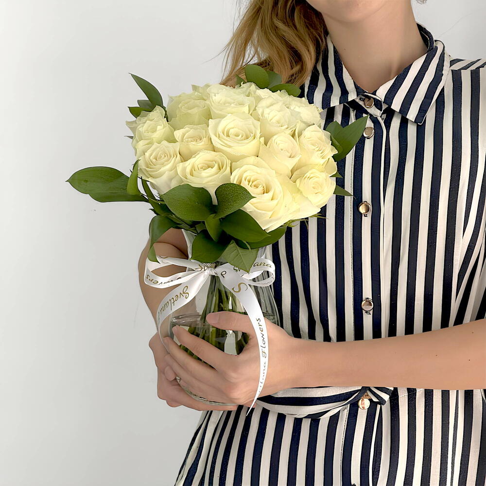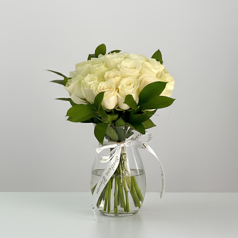 Eleva cualquier momento con la pura elegancia de nuestro arreglo en jarrón de 21 rosas blancas. Seleccionadas a mano por sus pétalos exuberantes y su belleza serena, estas inmaculadas rosas blancas se disponen con follaje fresco en un elegante jarrón de cristal, creando una composición que irradia paz, gracia y un encanto atemporal. Simbolizando pureza, nuevos comienzos y sinceridad genuina, este ramo es perfecto para expresar amor, ofrecer consuelo, celebrar hitos o añadir un toque de lujo a cualquier hogar u oficina. Cada tallo está elaborado con cuidado para transmitir calma, belleza y una sofisticación discreta—un arreglo que habla suavemente pero deja una impresión poderosa. Envía un mensaje de pureza y elegancia — pide hoy el arreglo en jarrón de 21 rosas blancas para entrega rápida y premium en todo Dubái.