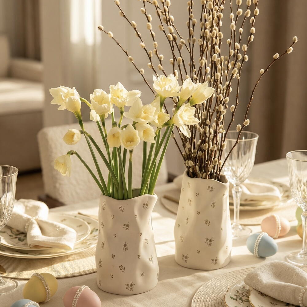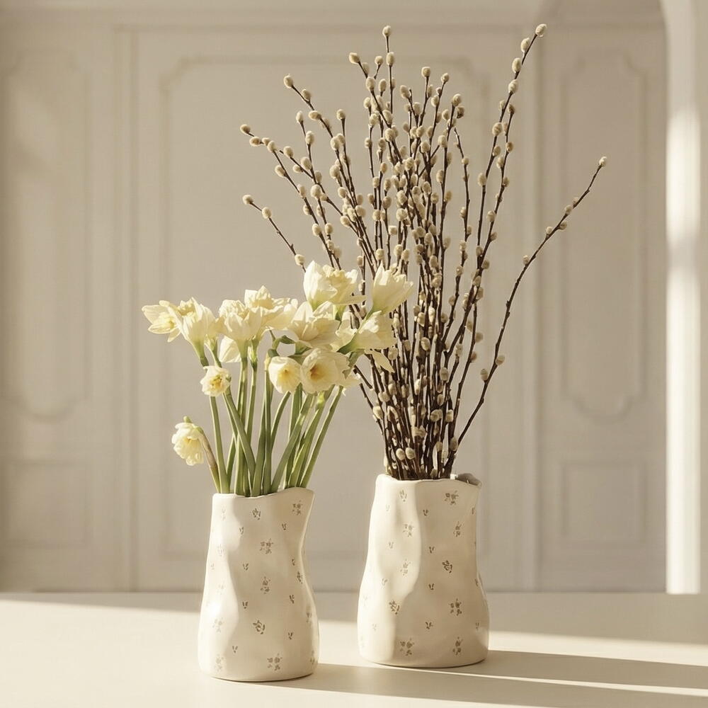 Un elegante dúo de ramas frescas de sauce y delicados narcisos en elegantes jarrones de cerámica. Los suaves tonos amarillos y crema de los narcisos y la textura natural del sauce llenan tu espacio de luz y un ambiente primaveral. Ideal para la decoración de Pascua y Domingo de Ramos o como un detalle especial para tus seres queridos. El conjunto incluye un jarrón, una tarjeta personalizada, instrucciones de cuidado, fertilizante para flores y una bolsa para flores. *Entrega de flores hoy mismo.