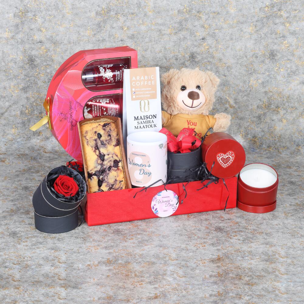 1 Red Forever Rose in Black Box, You Are Amazing Teddy 20cm, Arabic Coffee 100gm, Womens Day Coffee Mug, 1 Blueberry Loaf Cake, 1 Scented Tin Candle, 1 Bath and Body Works Gift Set - Shower Gel 88ml, Body Cream 70g and Mist 75ml, Arranged in a Acrylic Red Tray