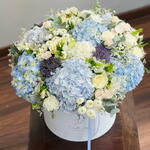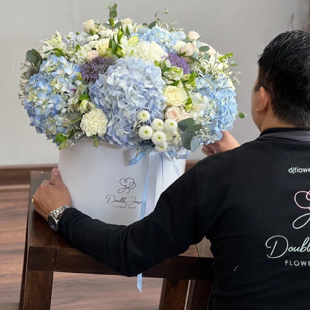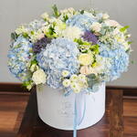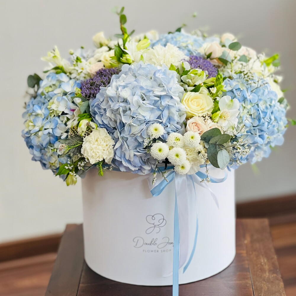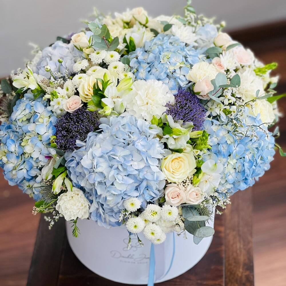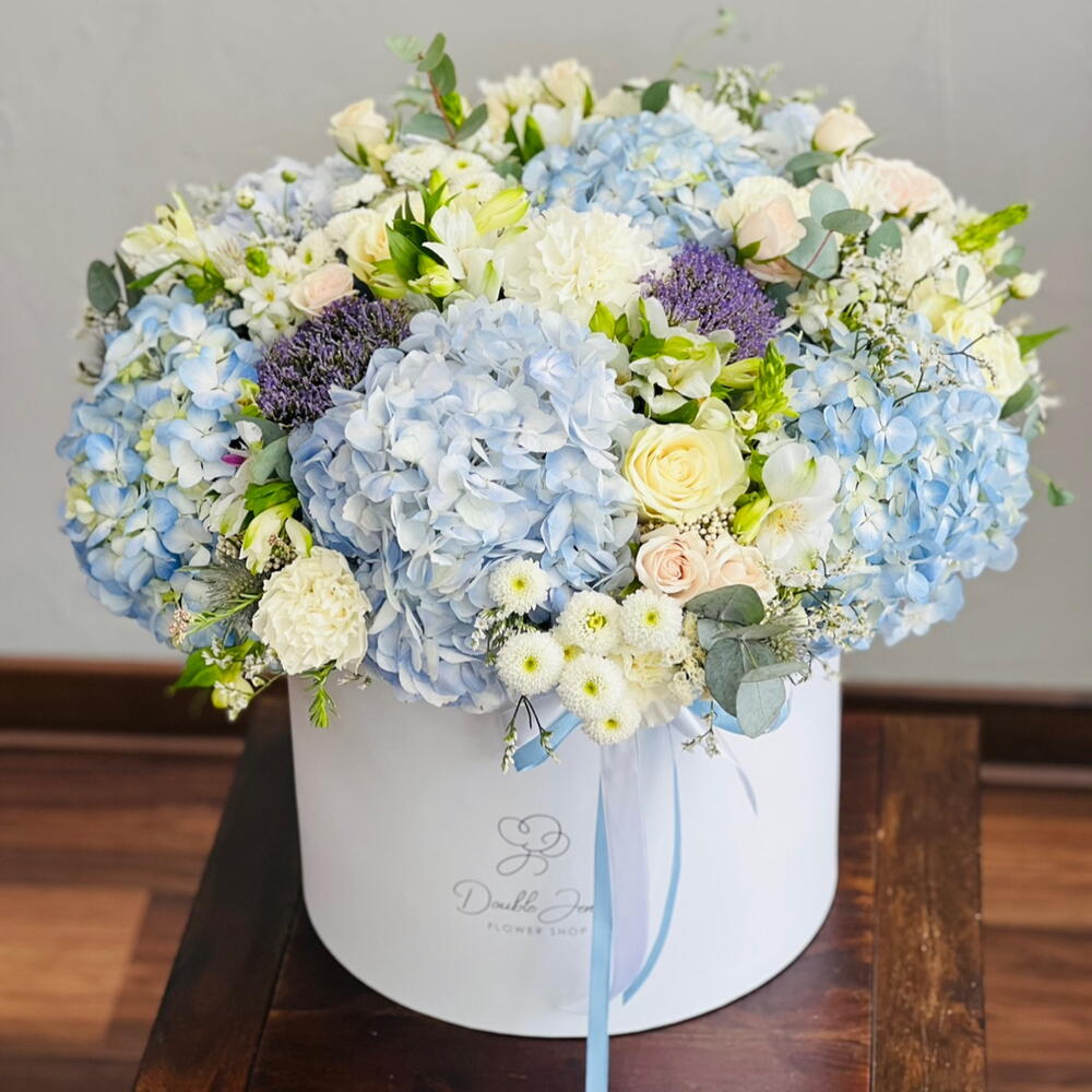 Ornithogalum - 10 ud. Eucalyptus - 30 ud. Spray rose - 30 ud. Limonium - 20 ud. El crisantemo - 20 ud. Alstroemeria - 20 ud. rose - 30 ud. clavel blanco - 20 ud. hydrangea blue - 8 ud. erygnioum - 5 ud. alium - 5 ud.