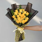Irradia alegría y positividad con este impresionante ramo de vibrantes rosas amarillas, un símbolo de amistad, felicidad y nuevos comienzos. Envuelto elegantemente en papel negro y moderno con un toque de malla dorada y una cinta a juego, este arreglo desprende sofisticación y encanto. Las flores de un amarillo soleado están bellamente complementadas por delicado follaje y velo de novia, creando una mezcla armoniosa de luminosidad y elegancia. Perfecto para cualquier ocasión festiva o como un gesto atento para alegrar el día de alguien, este ramo es un deleite alegre. Cada rosa está seleccionada a mano por su frescura, garantizando una exhibición duradera de belleza. ¡Comparte el regalo de sol y felicidad con esta radiante obra maestra floral!