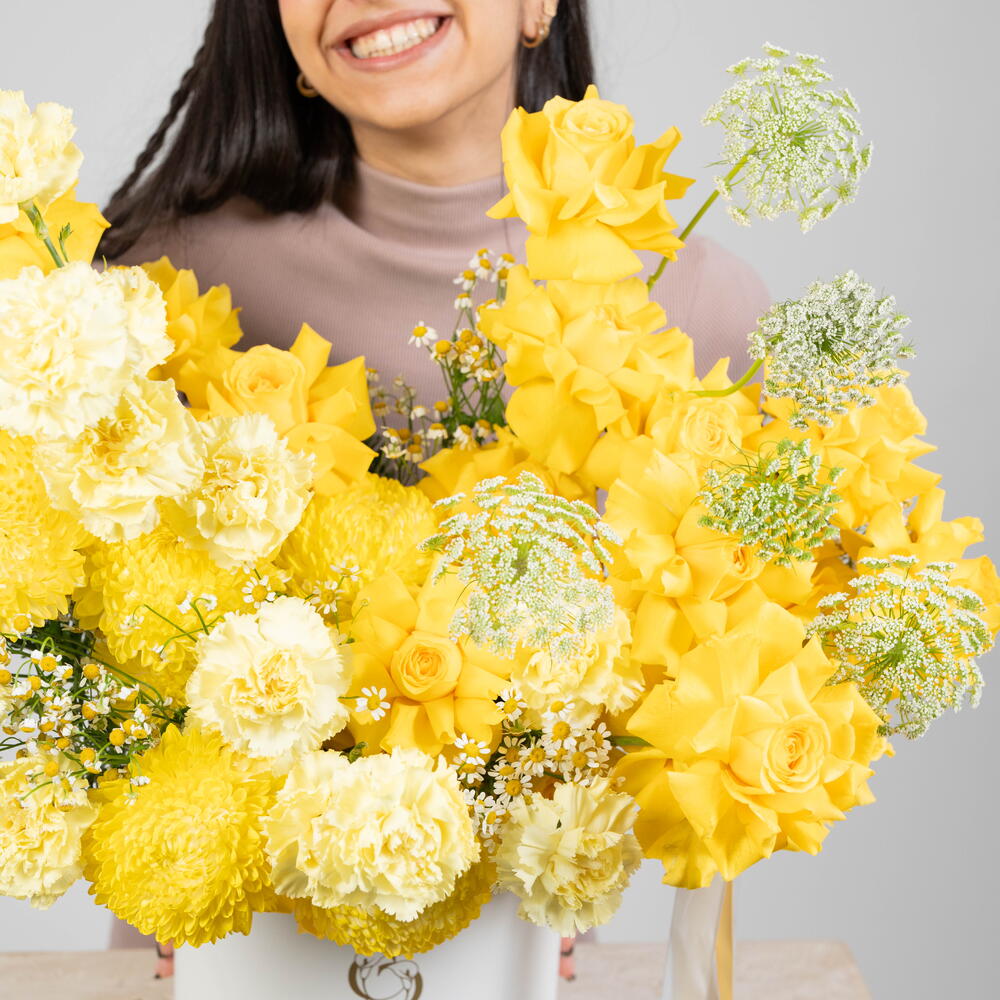 rosa amarilla - 33 ud. tanacetum - 7 ud. ammi majus - 5 ud. clavel amarillo - 12 ud. amarillo decorativo - 5 ud.