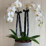 Esta lujosa caja de terciopelo contiene dos exquisitas orquídeas adornadas con lazos de seda aptas para todas las ocasiones