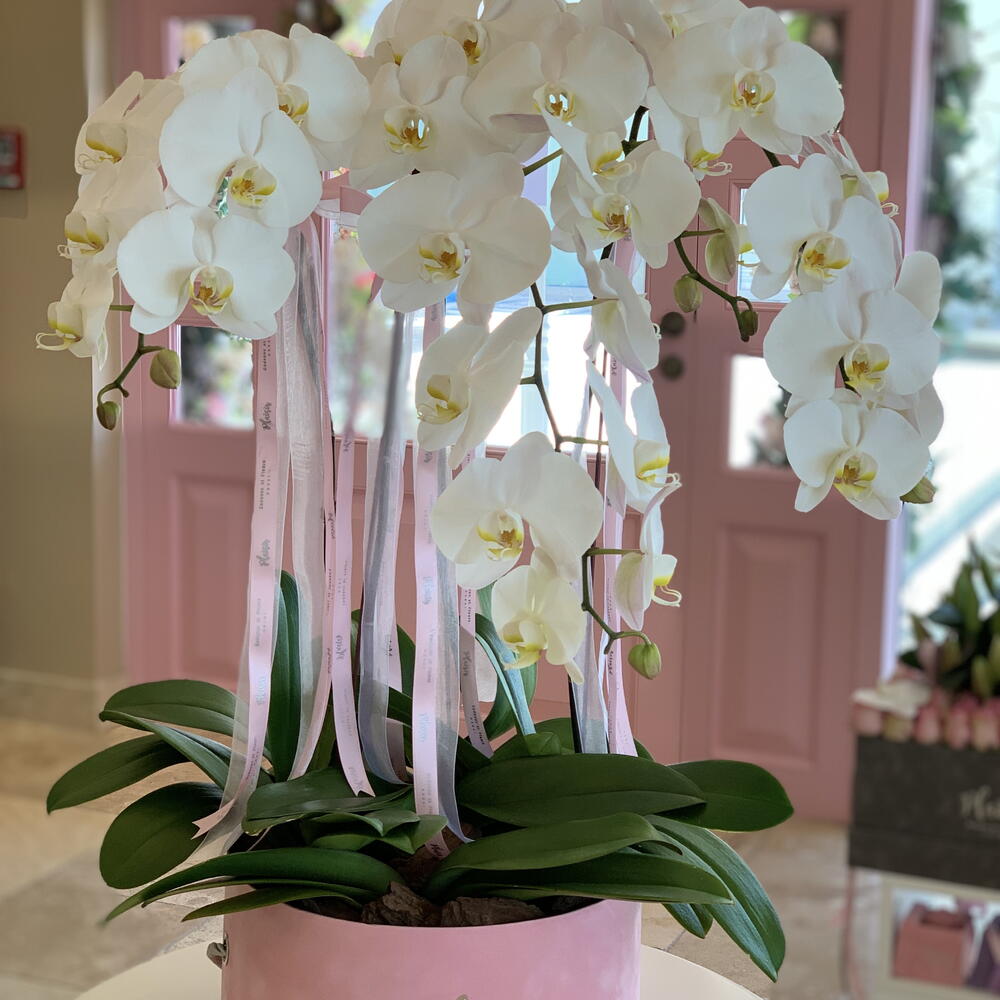 4 impresionantes orquídeas blancas en la lujosa sombrerera rosa hecha a medida de Plaisir, decorada con ramas de sauce y astillas de madera, adornada con lazos de organza de seda. ¡Un regalo de altísimo lujo para impresionar a la destinataria y hacerla sonreír durante días!