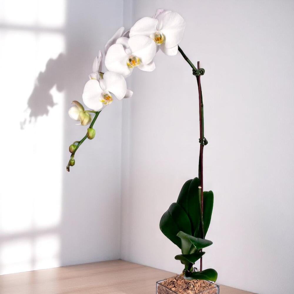 Aporta elegancia atemporal y belleza moderna a cualquier espacio con esta elegante orquídea blanca. El grácil tallo arqueado de la orquídea Phalaenopsis presenta flores blancas inmaculadas con suaves centros amarillos, que simbolizan pureza, sofisticación y paz. Presentada en una maceta transparente y minimalista, esta impresionante orquídea es perfecta para la decoración del hogar, espacios de oficina o como un regalo pensado para cumpleaños, aniversarios u ocasiones corporativas. Sus flores de larga duración y su fácil cuidado la convierten en una opción ideal para quienes buscan una elegancia sin esfuerzo.