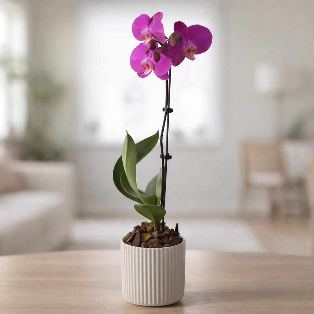 Planta de orquídea púrpura refinada (65 cm de altura) conocida por sus flores de larga duración, sus ricos tonos violetas y su elegancia atemporal. Las orquídeas simbolizan la belleza, la fortaleza y la admiración—lo que convierte a esta planta en una opción perfecta para regalos sofisticados y para interiores con estilo. Ideal para clientes que buscan planta de orquídea púrpura, entrega de orquídeas, planta de interior de lujo, regalo de planta con floración o planta de orquídea en Dubái. Una opción popular para regalos corporativos, plantas para inauguración de casa, decoración de oficinas y elegantes regalos de cumpleaños o aniversario. Esta planta de orquídea viva es fácil de mantener, prospera en interiores con luz indirecta y llega fresca en una maceta premium, lista para exhibir. A diferencia de las flores cortadas, las orquídeas ofrecen un disfrute prolongado—semanas de floración con un cuidado mínimo. Disponible para entrega de plantas el mismo día en Dubái, empaquetada cuidadosamente para asegurar un transporte seguro y que llegue en condiciones impecables.