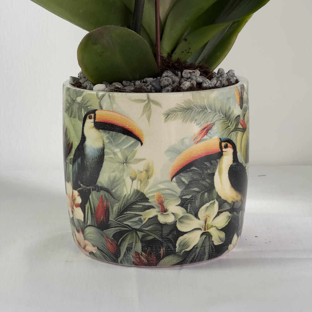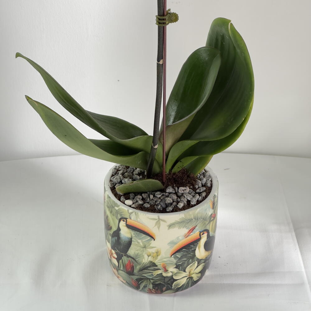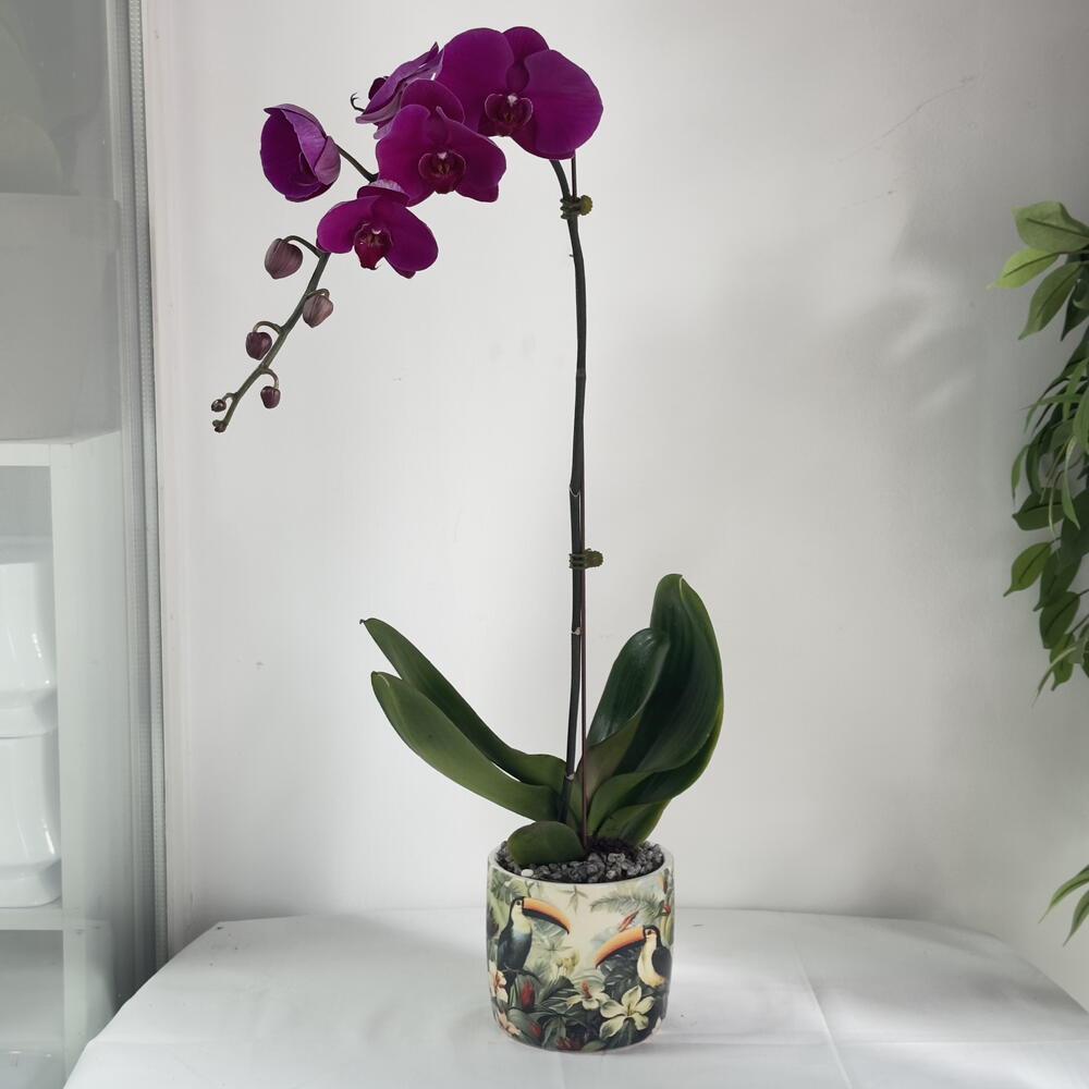 Revela un momento de tranquila majestad con nuestra Orquídea Phalaenopsis Real Púrpura—un único tallo esbelto coronado por pétalos aterciopelados de violeta regio. Acunada en una maceta de diseño minimalista, esta escultura viva susurra admiración, dignidad y belleza refinada, elevando cualquier interior de lo cotidiano a lo extraordinario. Enraizada en siglos de tradición orquidófila, pero a la vez increíblemente moderna, la Phalaenopsis ofrece semanas—y a veces meses—de floración continua. De bajo mantenimiento por naturaleza, prospera con luz suave e indirecta y recompensa una rutina de riego moderada con una gracia duradera. Por qué cautiva Simbología: las orquídeas moradas transmiten respeto, profunda admiración y un toque de prestigio real—ideales para regalos por hitos, gestos corporativos o caprichos de autocuidado. Calidad premium: cultivada en vivero, seleccionada a mano y enviada en flor para un impacto inmediato. Maceta de diseño incluida: elegante recipiente de cerámica que complementa cualquier estilo de decoración, del clásico al contemporáneo. Cuidados sencillos: guía paso a paso incluida—no se requiere mano verde. Declaración versátil: acento perfecto para entradas, escritorios de oficina, mesas de café o mesitas de noche. Regala la Phalaenopsis Real Púrpura y deja que cada flor hable de elegancia—prueba de que un tallo perfecto puede dominar una habitación, inspirar serenidad y convertir momentos ordinarios en recuerdos que se heredan.