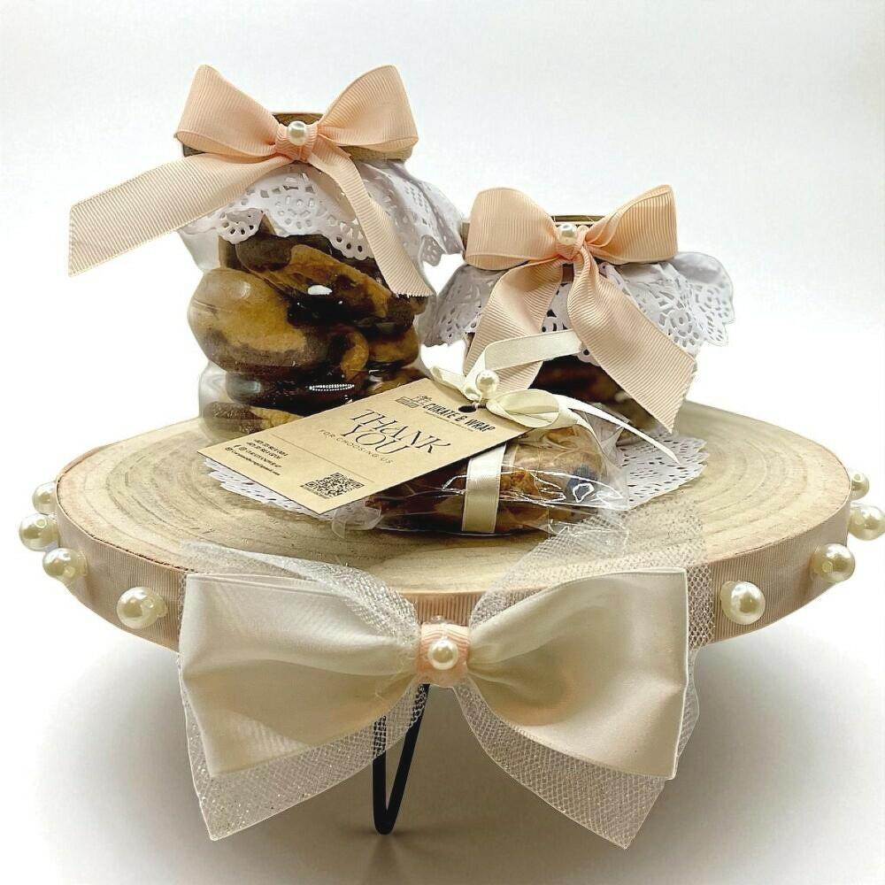 Este elegante set de regalo está diseñado para deleitar la vista y el paladar. Incluye un frasco mediano de vidrio lleno de galletas gourmet, un frasco pequeño de galletas y un paquete de galletas surtidas, lo que lo convierte en el equilibrio perfecto entre placer y encanto. Los frascos están adornados con encaje, lazos de satén y perlas, bellamente dispuestos sobre una bandeja rústica de madera decorada con lazos y perlas. Una tarjeta personalizada le da un toque especial, convirtiendo este set en una opción ideal para cualquier ocasión. Conserve las galletas en un lugar fresco y seco, y asegúrese de que los frascos y paquetes estén bien cerrados después de cada uso para conservar su frescura. Contenido: 1. Galletas con chispas de chocolate: Harina (de trigo), azúcar, mantequilla (de leche), huevos, chispas de chocolate (de azúcar, pasta de cacao, manteca de cacao, lecitina de soja), bicarbonato de sodio, extracto de vainilla, sal. 2. Lavash: Harina (de trigo), aceite de oliva, sal, agua, levadura, hierbas y especias. 3. Brownie de chocolate: Chocolate negro, mantequilla (leche), azúcar, huevos, harina (trigo), cacao en polvo, extracto de vainilla, levadura química, sal. Alérgenos: trigo (gluten), leche, huevos, soja. Puede contener trazas de frutos secos y sésamo (según la cobertura del lavash). Elaborado en unas instalaciones que también procesan frutos secos y cacahuetes.