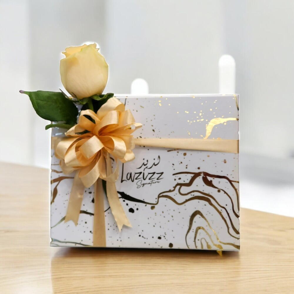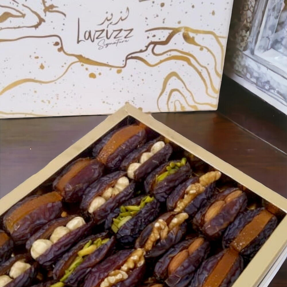 Esta caja exclusiva contiene dátiles mejdool recién preparados y rellenos Contenido: 4 piezas de dátiles mejdool rellenos de cáscara de naranja 4 piezas de dátiles mejdool rellenos de almendra 4 piezas de dátiles mejdool rellenos de nuez 4 piezas de dátiles mejdool rellenos de pistacho 4 piezas de dátiles mejdool rellenos de avellana 4 piezas de dátiles mejdool rellenos de anacardo Se añade una flor a la caja, como se ve en la imagen