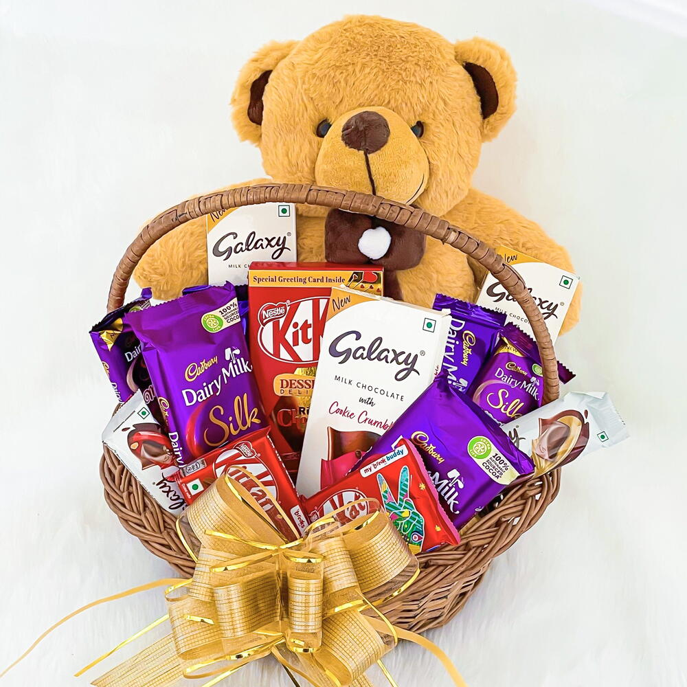 oso de peluche mediano - 1 ud. nestle kitkat postre - 150 gr kitkat 2 unidades - 36 gr chocolate con leche Galaxy - 90 ud. galaxy chocolate con leche 50gm 2 pc - 50 gr galaxy chocolate 20 g 2 unidades - 20 gr Dairy Milk Silk 130g - 2 uds - 130 gr dairy milk silk 60 g 2 uds - 60 gr