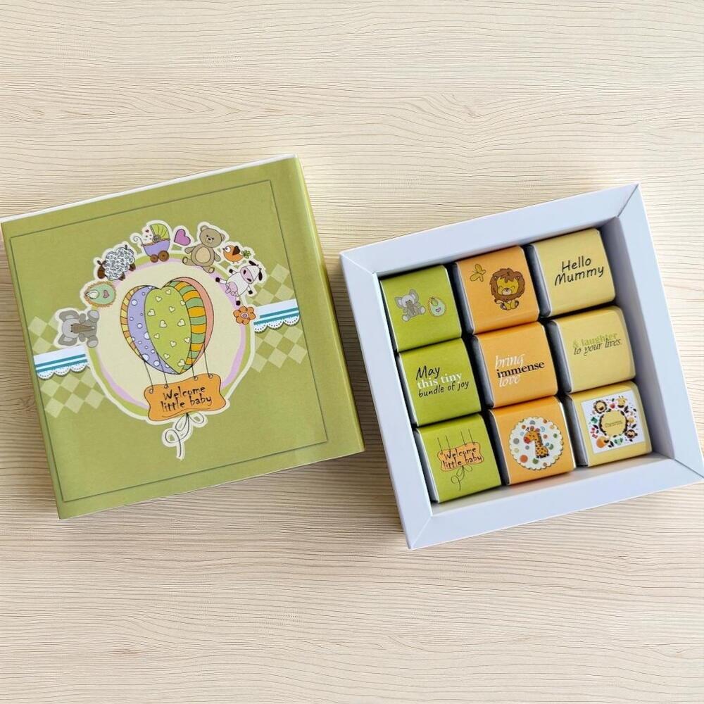 Caja de chocolate Bienvenido bebé – 9 bombones belgas premium para nuevos padres