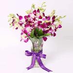 purple orchids - 10 pcs single ruscus leaves - 2 pcs deluxe patchi chocolates - 250 g glass vase and tied with a ribbon bow - 1 pcs