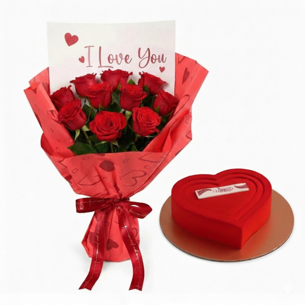 Celebrate your love in full bloom with our 10 Red Roses Bouquet with 500gm Heart Chocolate Cake combo, the perfect symbol of deep passion and devotion. Each rose is carefully hand-picked for its rich red color and velvety petals, arranged elegantly to create a stunning, romantic display. Wrapped with care and finished with a delicate ribbon, this bouquet makes an unforgettable gift for your Valentine, expressing “I love you” in the most timeless way. Highlights: 12 fresh, premium red roses with 500gm Red Velvet Cake Elegant wrapping with a ribbon finish Hand-delivered with care to your loved one Perfect for Valentine’s Day, anniversaries, or special romantic moments Show your love in grand style, 12 roses for 12 times the romance.