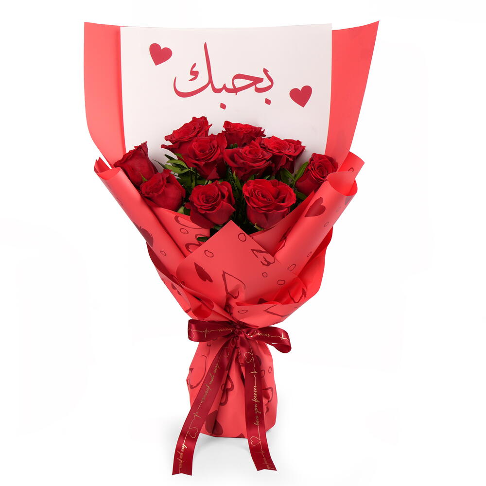 Celebrate your love in full bloom with our 10 Red Roses Bouquet, the perfect symbol of deep passion and devotion. Each rose is carefully hand-picked for its rich red color and velvety petals, arranged elegantly to create a stunning, romantic display. Wrapped with care and finished with a delicate ribbon, this bouquet makes an unforgettable gift for your Valentine, expressing “I love you” in the most timeless way. Highlights: 12 fresh, premium red roses with Arabic written I Love You wrap Elegant wrapping with a ribbon finish Hand-delivered with care to your loved one Perfect for Valentine’s Day, anniversaries, or special romantic moments Show your love in grand style, 12 roses for 12 times the romance.