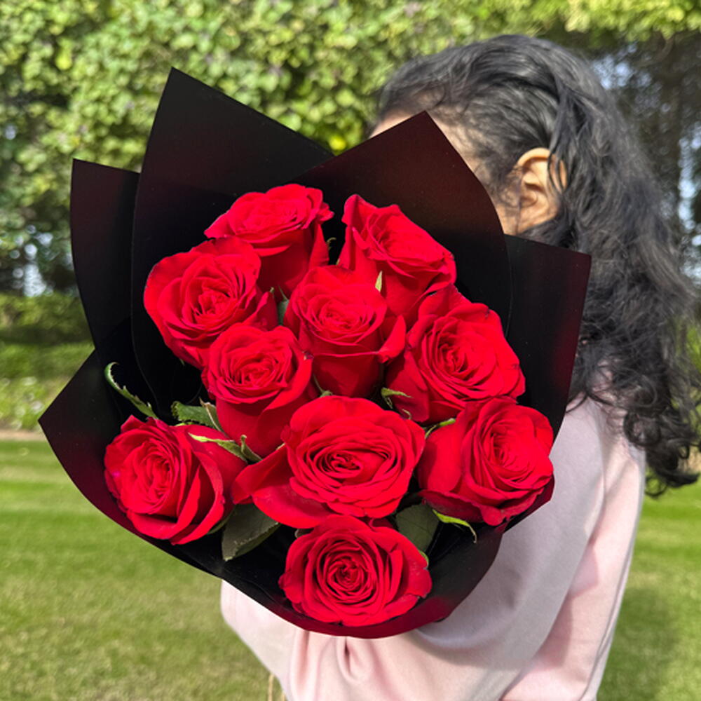 A mix of Beautiful 10 Red roses with Black wrapper Giving 10 roses signifies that you think the recipient is perfect in every way