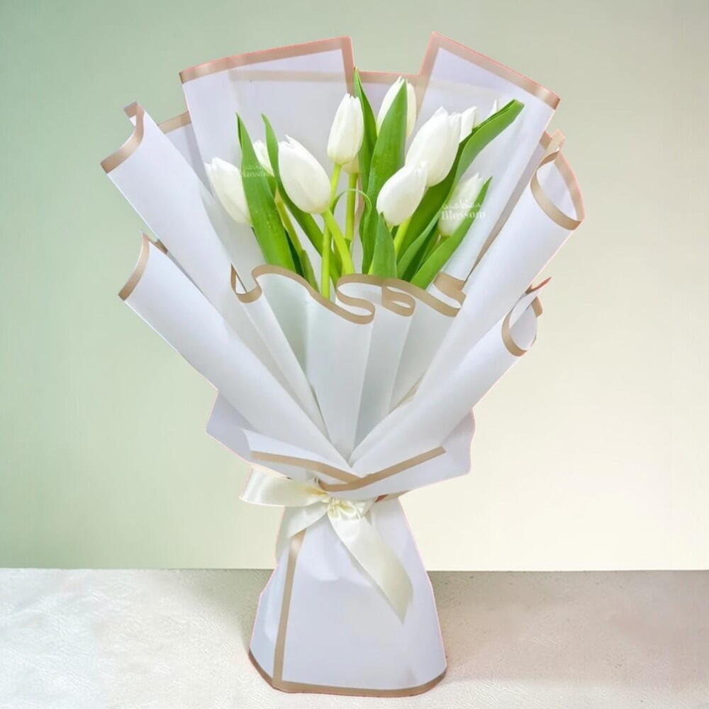 Bouquet of 10 white tulips with fillers in a nice wrapping. Elegant bouquet of 10 white tulips with delicate fillers, beautifully wrapped in premium paper for a fresh and graceful look. This white tulip bouquet is perfect for weddings, anniversaries, and special occasions. Fresh, handpicked tulips offer purity, elegance, and long-lasting beauty. Care tip: Trim stems at an angle, place in clean water, and keep away from direct sunlight. Change water every 2 days to maintain freshness and extend vase life.