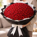 100 fresh flower bouquet made with natural, live roses. Perfect for birthdays, anniversaries, and special occasions. features rich red roses arranged with delicate baby’s breath and fresh greenery, wrapped in natural black paper with a soft ivory ribbon