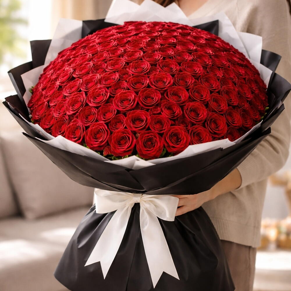100 fresh flower bouquet made with natural, live roses. Perfect for birthdays, anniversaries, and special occasions. features rich red roses arranged with delicate baby’s breath and fresh greenery, wrapped in natural black paper with a soft ivory ribbon