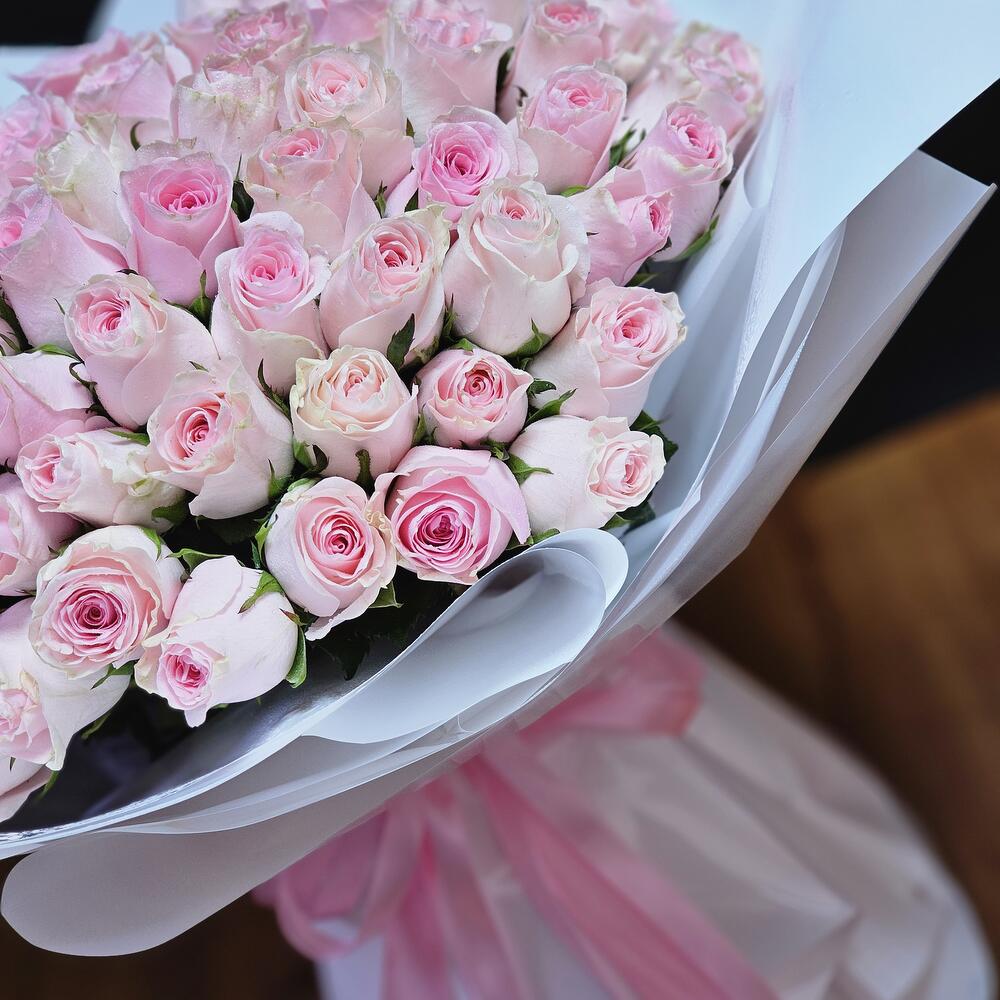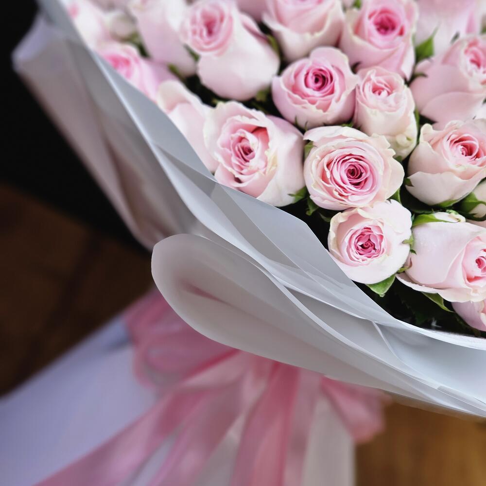 A BEAUTIFUL BOUQUET 100 LIGHT PINK ROSES IN WHITE WRAPPING WITH PINK RIBBON.
