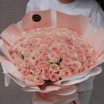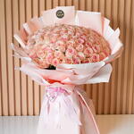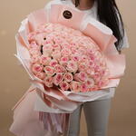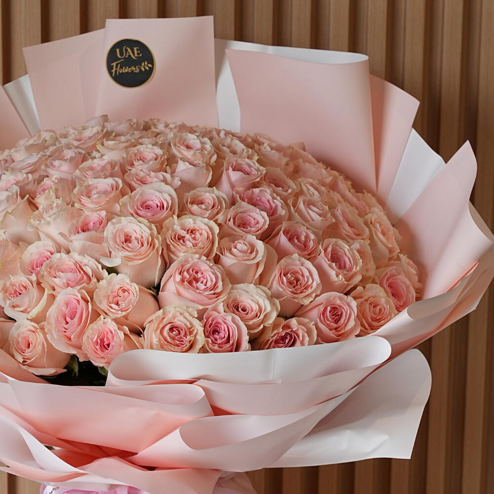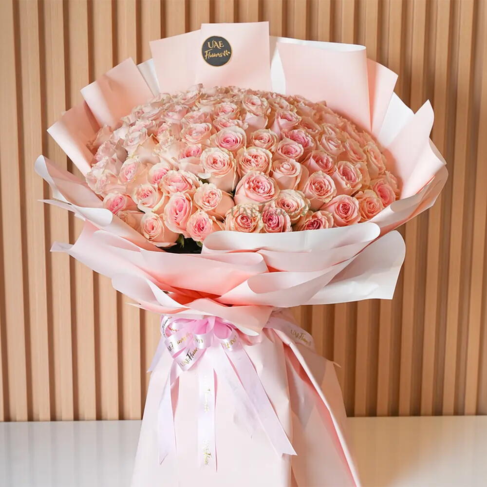 A bouquet of 100 pink roses in pink wrapping paper tied with a pink ribbon.