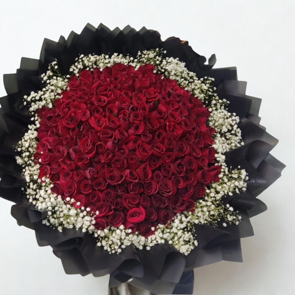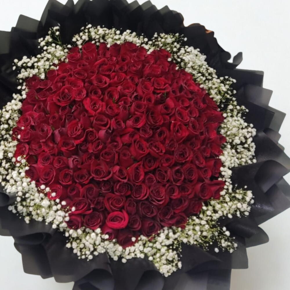 Dazzle your senses with this extravagant mono bouquet! Brimming with a hundred luxurious red roses, each one picked at the peak of perfection, this arrangement radiates allure and elegance. Tucked among the roses, youll find ten stems of textured jipso, adding depth and a whimsical touch to the design. Whether youre celebrating a milestone, expressing love, or simply making an ordinary day extraordinary, this lush bouquet is sure to enchant. Please note that flowers and colors could vary according to the season and availability.