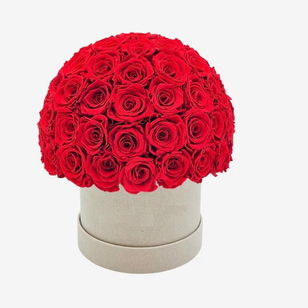 Immerse yourself in the grandeur of 100 meticulously selected roses, nestled elegantly in a stylish box. This enchanting ensemble of floral brilliance effortlessly portrays timeless beauty and refined luxury to any space. The perfect gesture to express love, admiration, or even just a simple thank you. Cherish these transitionally preserved roses that promise to captivate with their enduring charm.