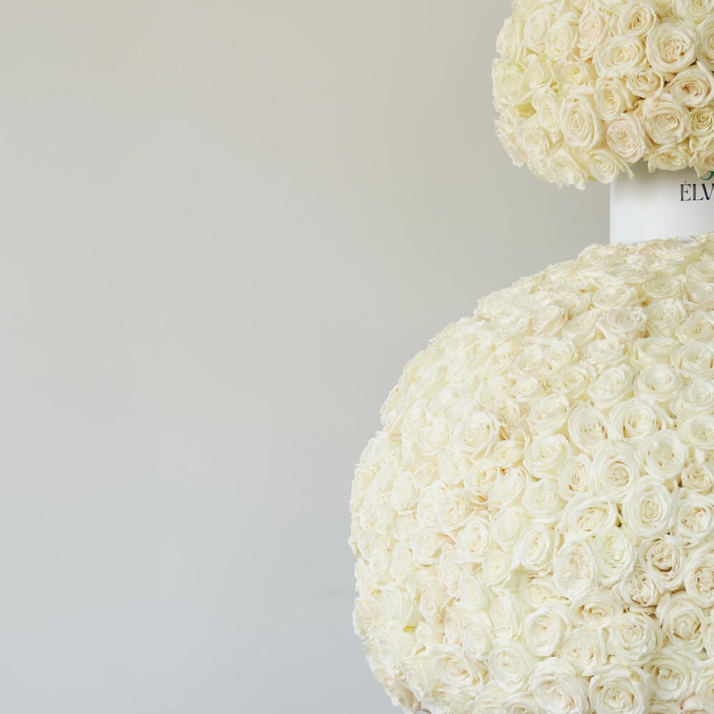 Ivory roses Dome feels pure and serene. Creamy ivory blooms create a soft, rounded form that allows calm and light to flow freely. The story here is one of stillness and grace — beauty that soothes the space and brings timeless refinement.
