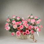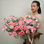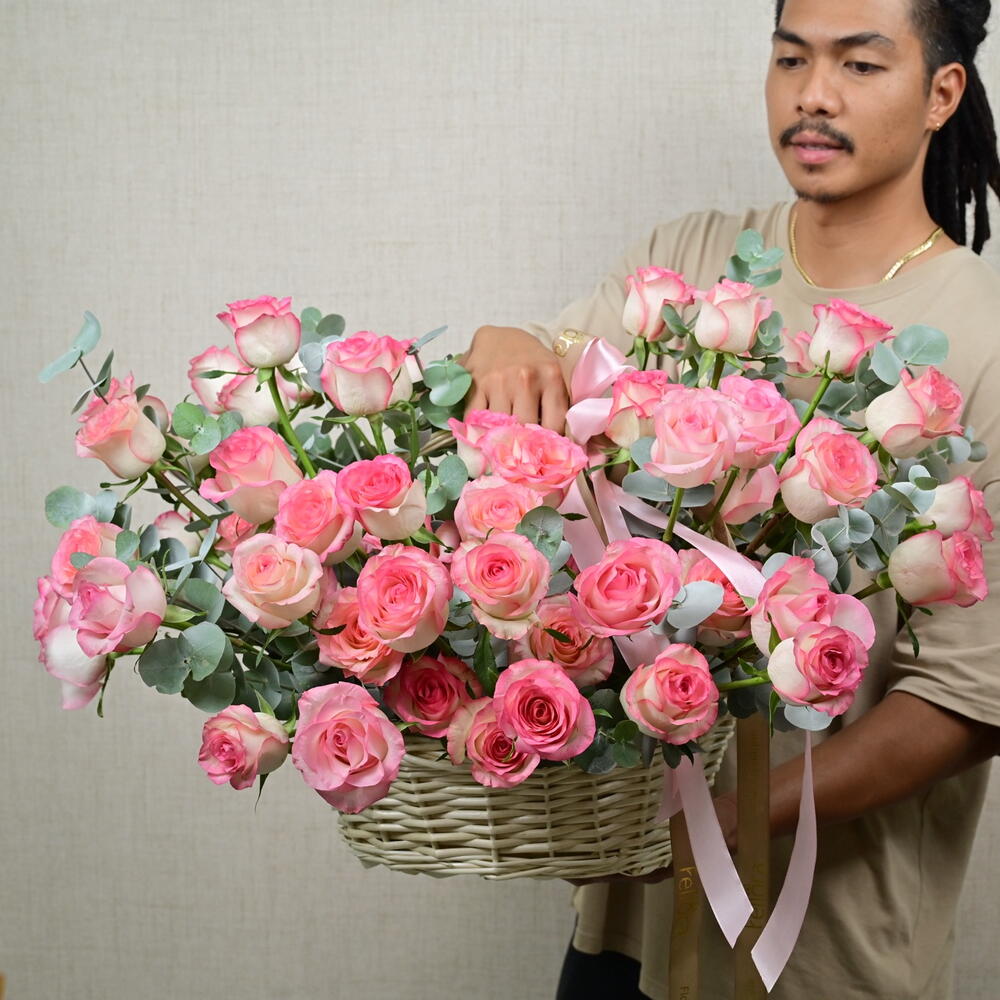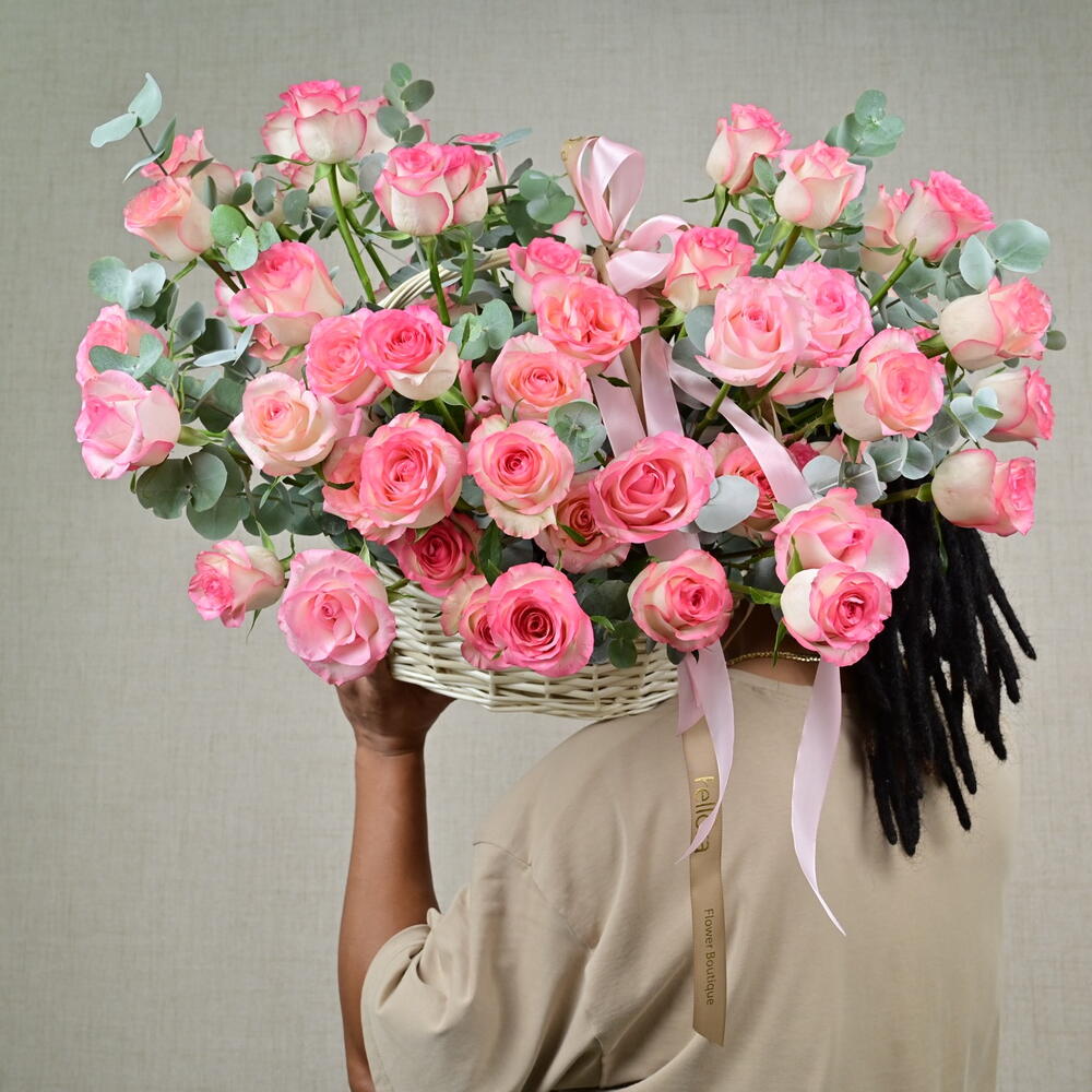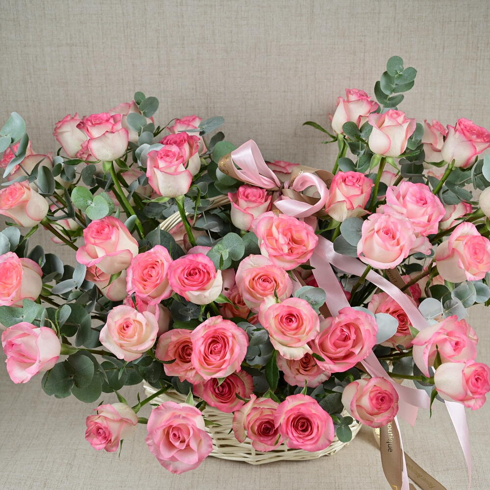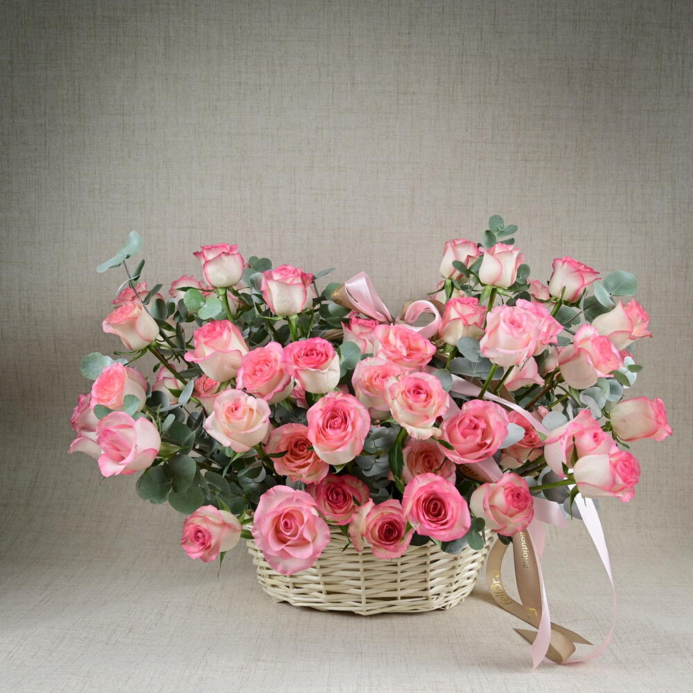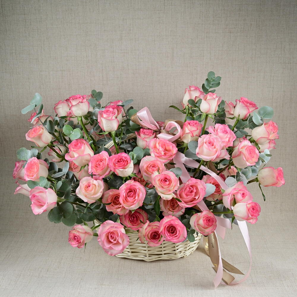 Flower basket of 101 jumilia roses with eucalyptus leaves