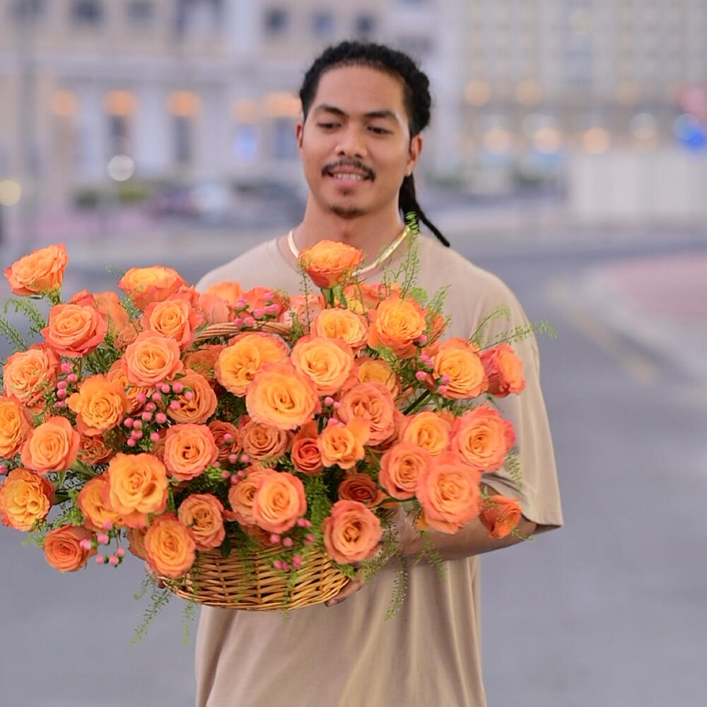 hypericum - 20 pcs orange rose - 101 pcs ribbon satin - 1 pcs wooden basket - 1 pcs lipidium - 10 pcs