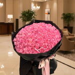 Exude pure elegance with this magnificent display of 101 premium 70cm pink roses. This lush, oversized bunch represents grace and poetic admiration, hand-tied to create a stunning dome of vibrant color. Perfectly wrapped in sophisticated paper with a trailing satin ribbon, it is an awe-inspiring gesture designed to make their heart skip a beat. The ultimate expression of luxury.
