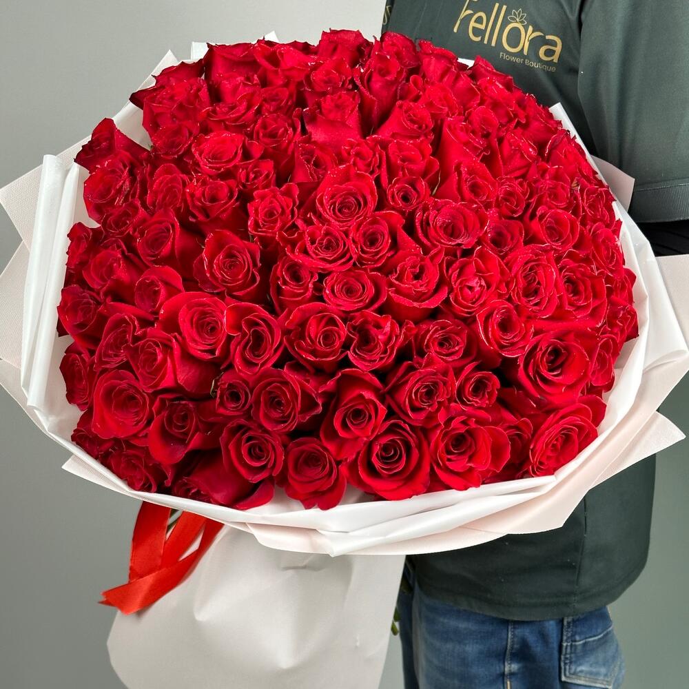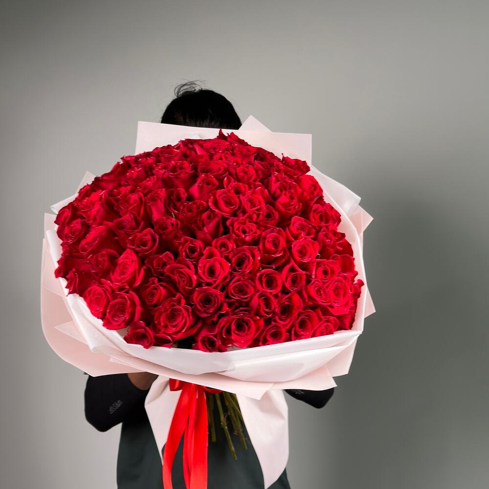 Make an unforgettable statement of love with 101 premium roses hand-selected and beautifully arranged to create a breathtaking display of romance. Wrapped in elegant light pink wrapping and finished with a red ribbon, each rose stands 50–70 cm tall for a truly luxurious look. Perfect for Valentine’s Day, proposals, and grand romantic gestures, backed by our **100% fresh flower guarantee**.