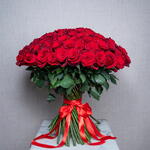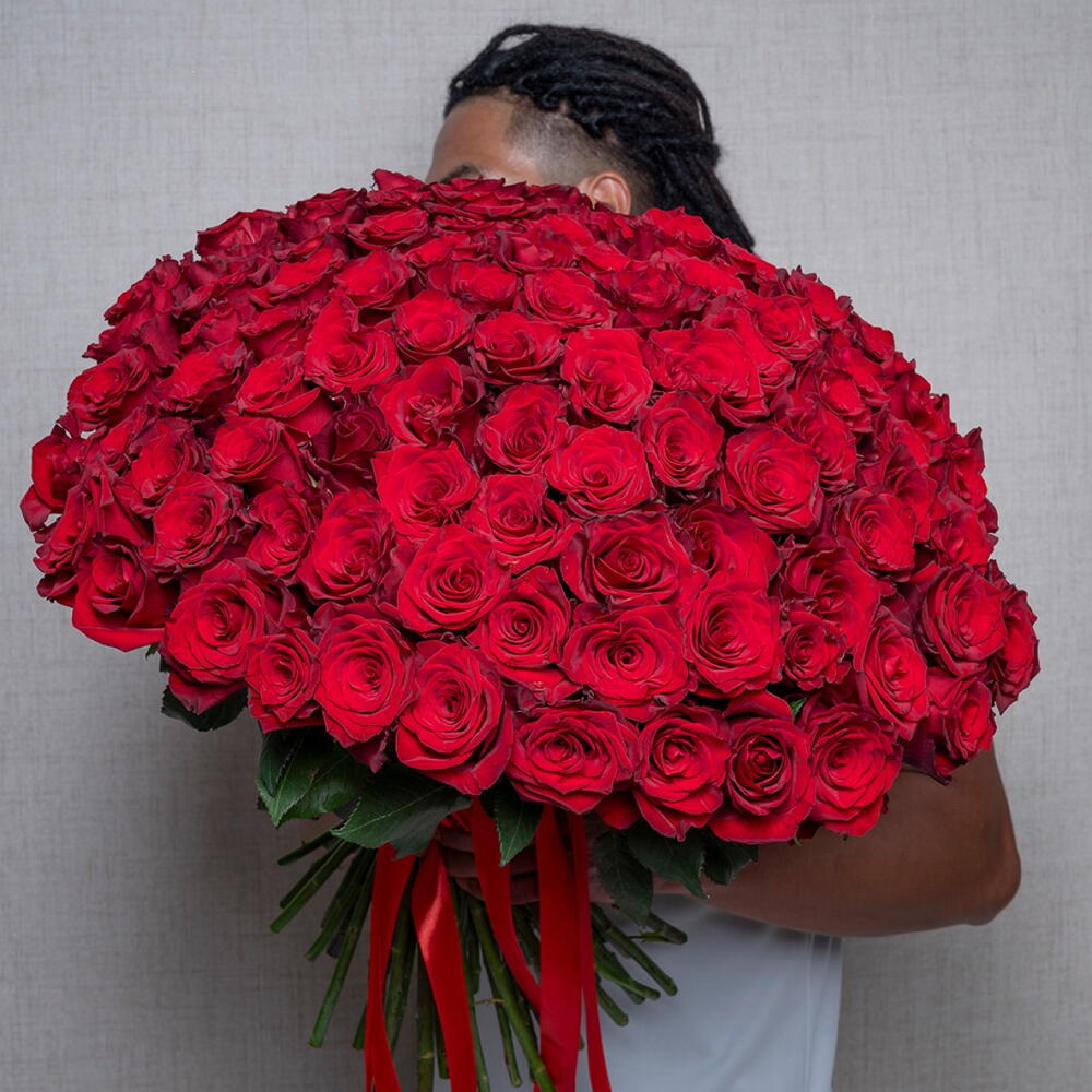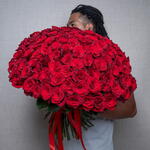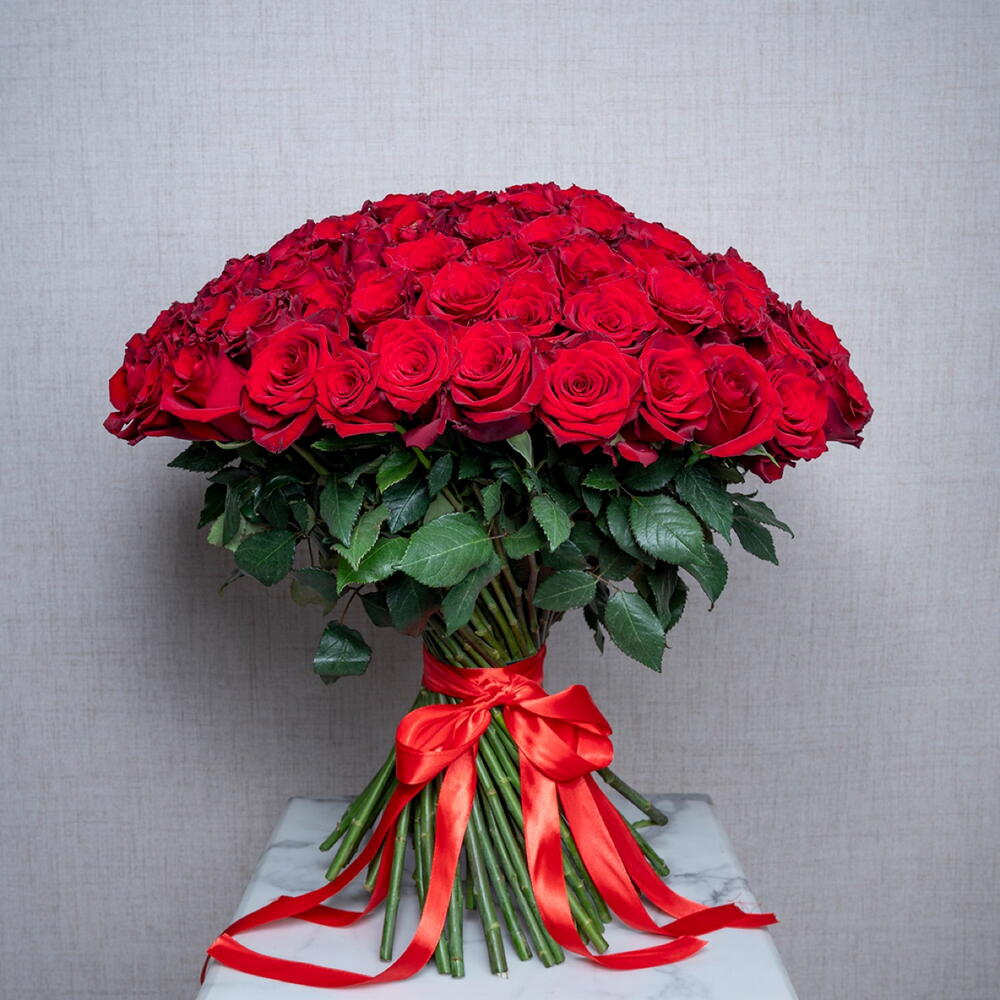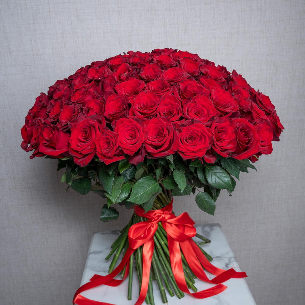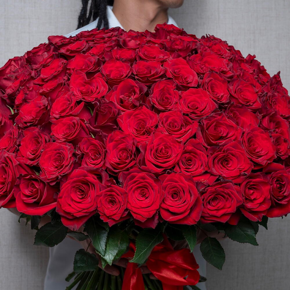 Hand tied bouquet of 101 stems red roses with tied red ribbon
