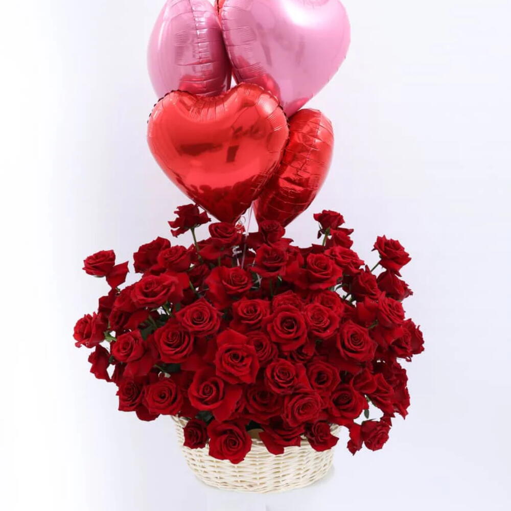 Luxury Rose Basket with Heart Balloons | 101 Ecuador Red Roses Product Detail: Includes 101 premium Ecuador red roses for a grand, luxurious look Arranged beautifully in a stylish basket Comes with 4 heart-shaped foil balloons for a romantic touch Perfect for anniversaries, proposals, birthdays, and special celebrations