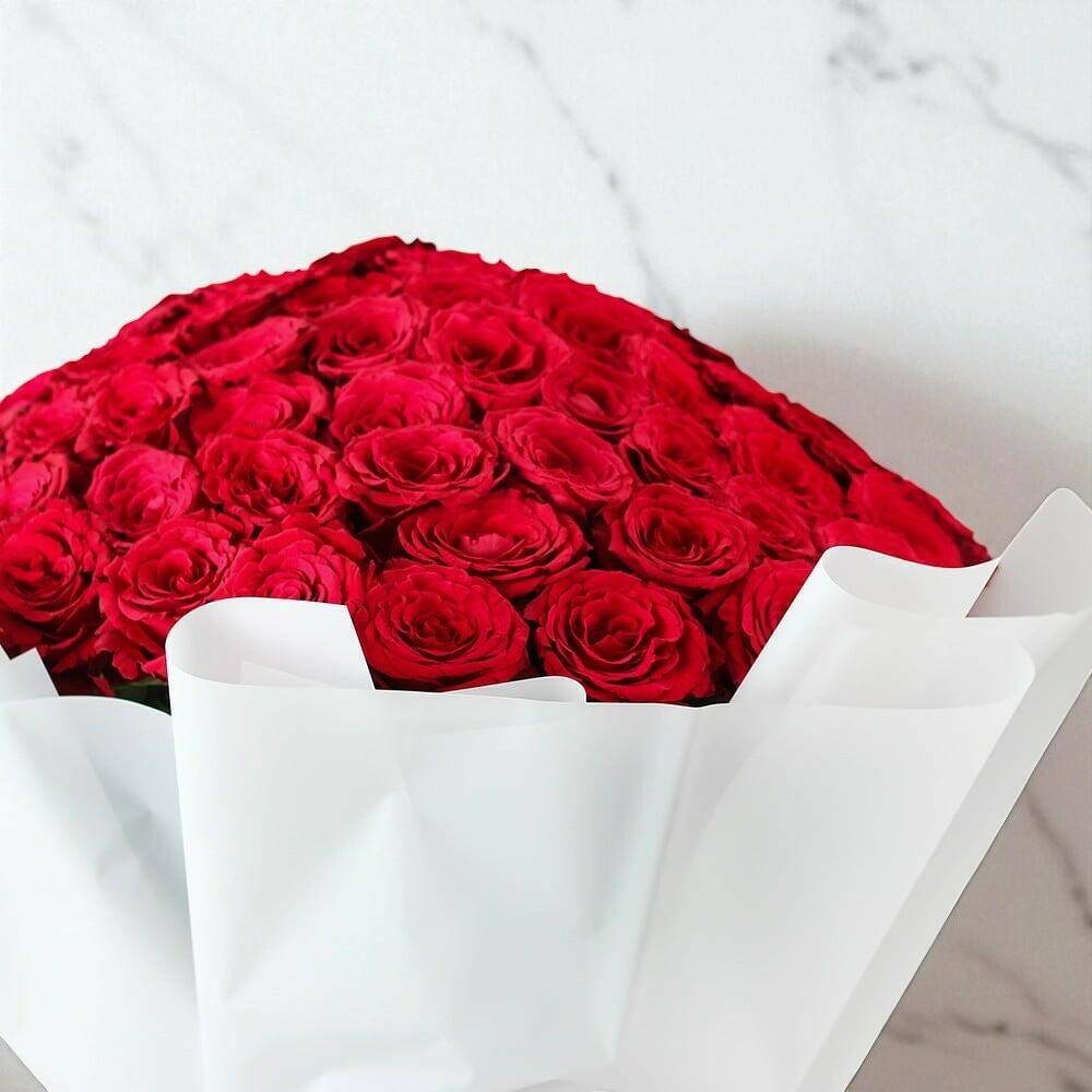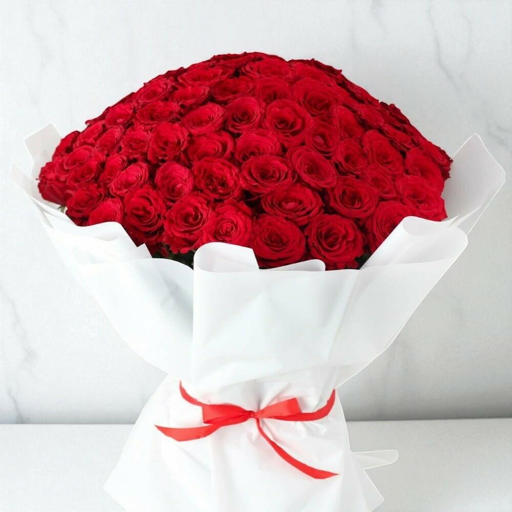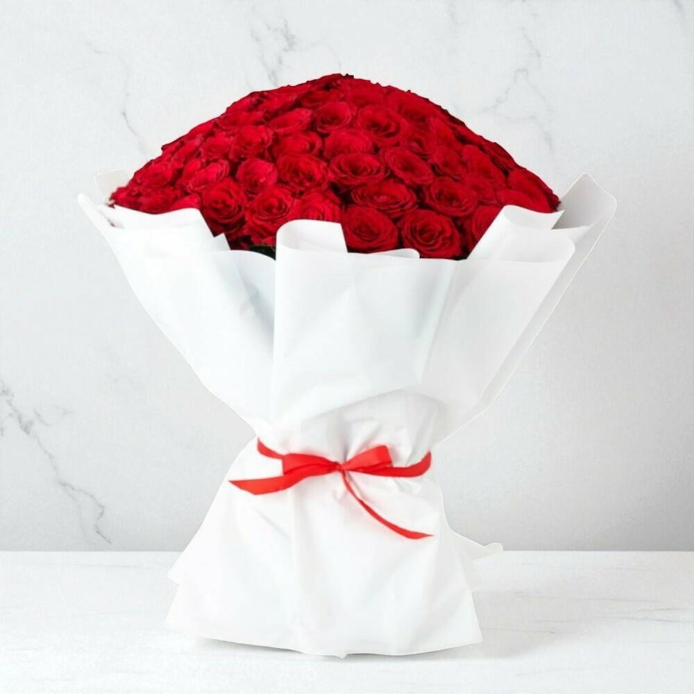 This luxurious bouquet of 101 red roses is the perfect way to express passionate love and heartfelt emotions. Each velvety bloom opens into a rich, deep red, radiating warmth and elegance. Beautifully wrapped in crisp white paper and tied with a red satin ribbon, it creates a striking contrast that draws every eye. Place this bouquet in a bright room to fill the space with romance and sophistication. To keep it fresh, trim the stems diagonally every 2–3 days, change the water regularly, and keep away from direct sunlight and drafts. This bouquet is ideal for anniversaries, romantic surprises, or special celebrations where love speaks louder than words. With proper care, the roses will delight for many days, bringing joy and beauty into your home. Available white, black and red wrapping. You can leave note for us incase of wrapping colour change.