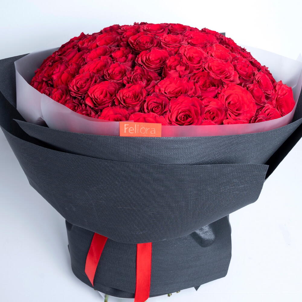 Make a bold romantic statement with 101 stunning red roses, elegantly wrapped in luxurious black paper and finished with a red ribbon. This breathtaking bouquet symbolizes deep love, passion, and commitment in the most dramatic way. The perfect Valentine’s Day flower bouquet to express unforgettable romance and heartfelt emotions.