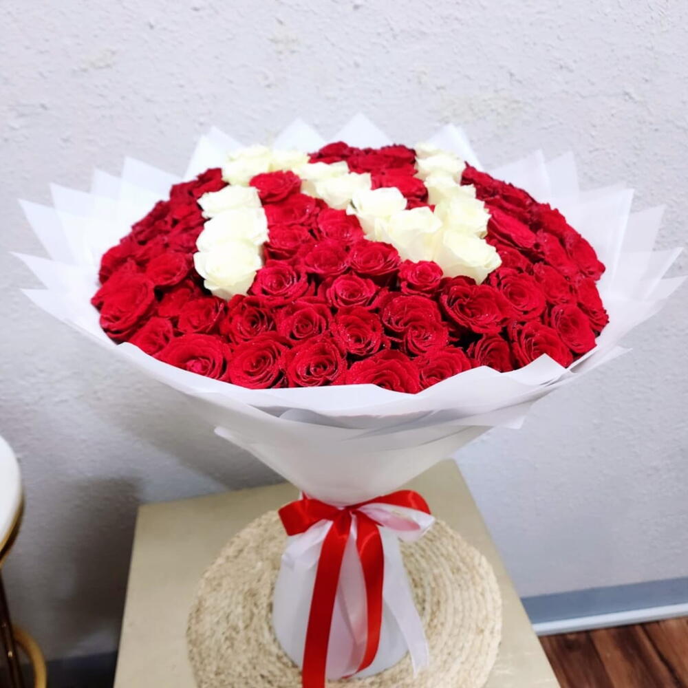 Immerse yourself in the sea of love with this staggering mono bouquet. Comprised of 86 red roses, symbols of deep affection and devotion, and 15 pristine white roses, emblems of purity and innocence, this bouquet is more than a bunch of flowers - its a timeless statement of passion and tenderness. Add a touch of opulence and romance to any occasion with this stunning floral arrangement.