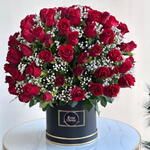 Immerse yourself in a sea of romance with our luxurious arrangement featuring 101 passionate red roses, and gypsophila delicately presented in a stylish box.