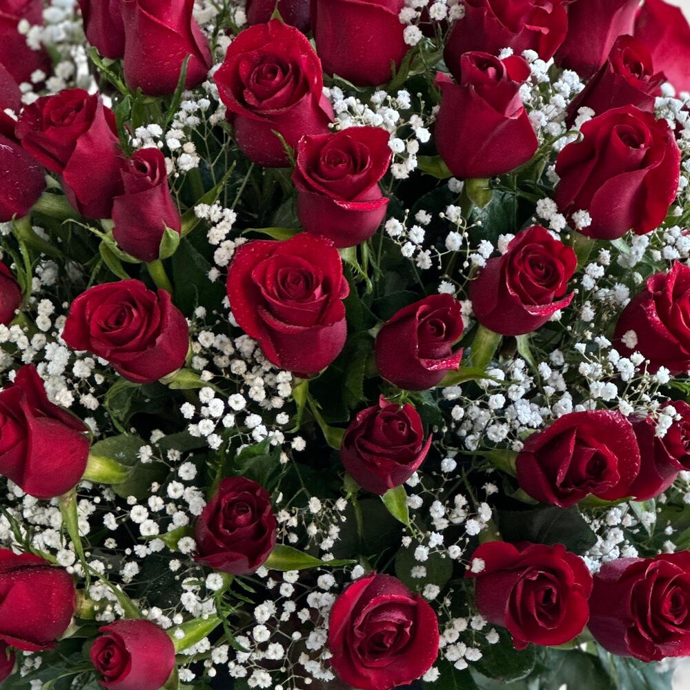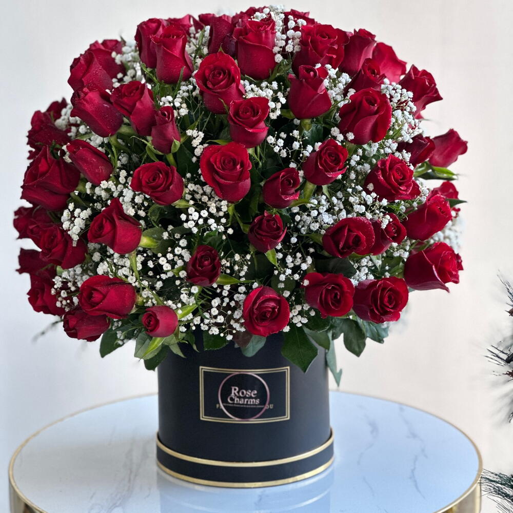 Immerse yourself in a sea of romance with our luxurious arrangement featuring 101 passionate red roses, and gypsophila delicately presented in a stylish box.