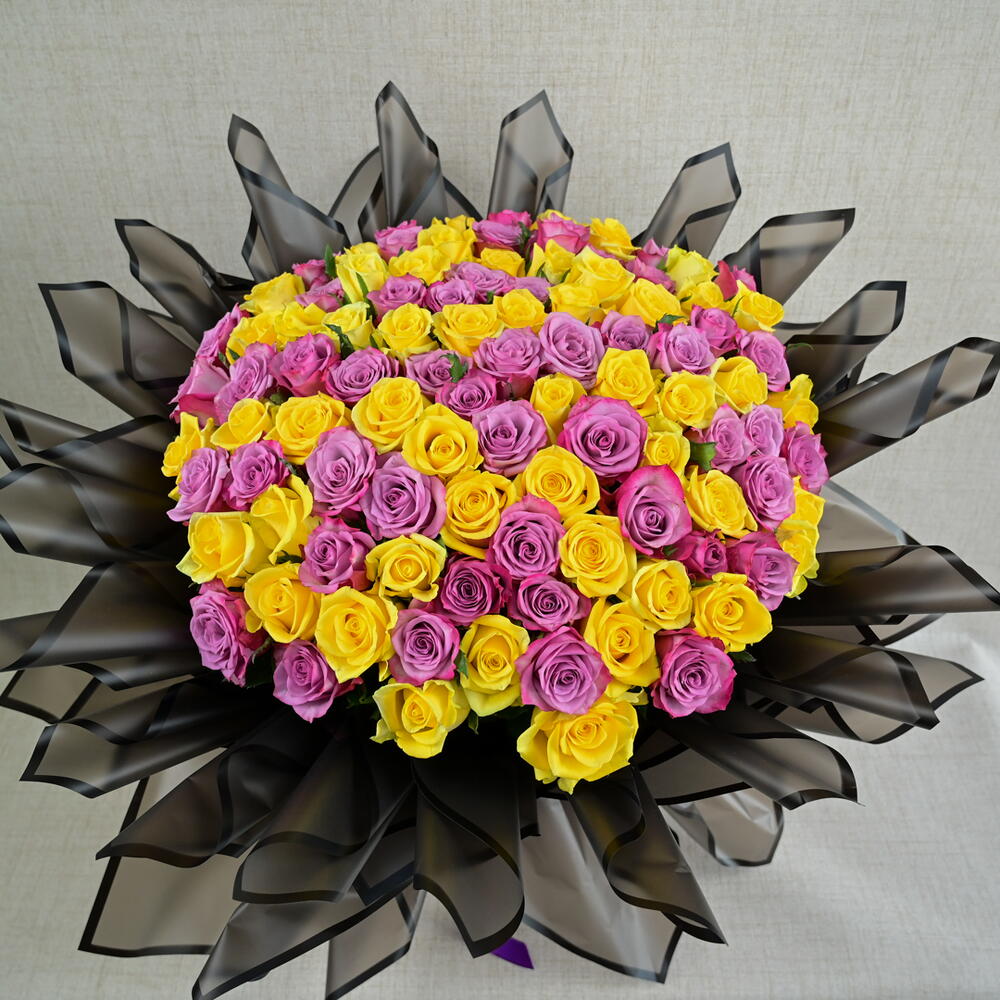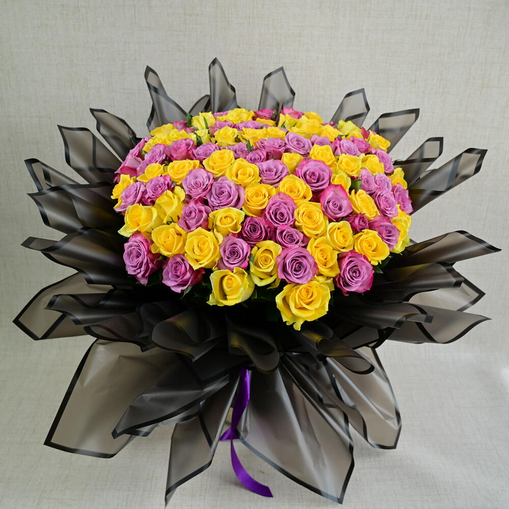 Ribbon - 1 pcs wrapping paper - 21 pcs purple roses - 51 pcs yellow roses - 50 pcs