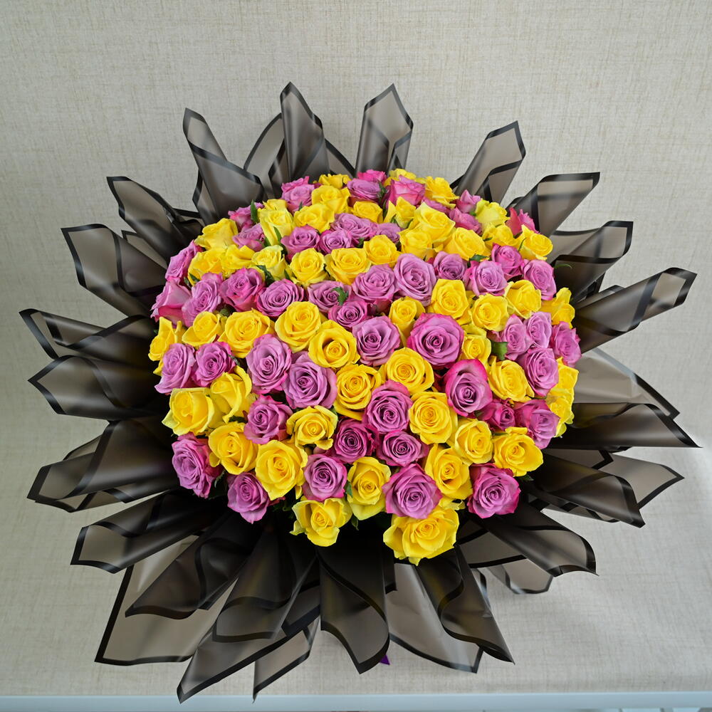 Experience the harmonious blend of colors with our Sunrise Serene Rose Arrangement, a stunning creation by Fellora Flower Boutique Dubai. This magnificent arrangement features: 50 Stems of Yellow Roses: Each rose exudes sunshine and joy with its brilliant yellow petals, symbolizing friendship and happiness. 51 Stems of Purple Roses: These rich, velvety purple roses add a touch of elegance and sophistication, creating a striking contrast with the yellow blooms. Dimensions: Height: 70 cm Width: 85 cm Perfect for grand celebrations, special occasions, or as a breathtaking centerpiece, the Sunrise Serene arrangement brings a burst of color and elegance to any space. Let Fellora Flower Boutique Dubai deliver this exquisite floral masterpiece to your doorstep, transforming your surroundings with natures finest hues.