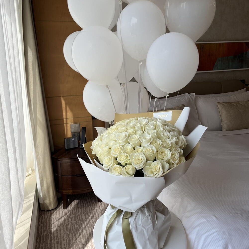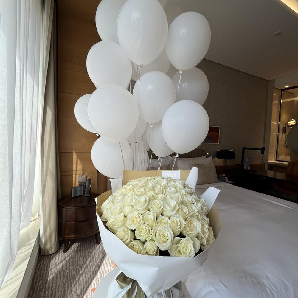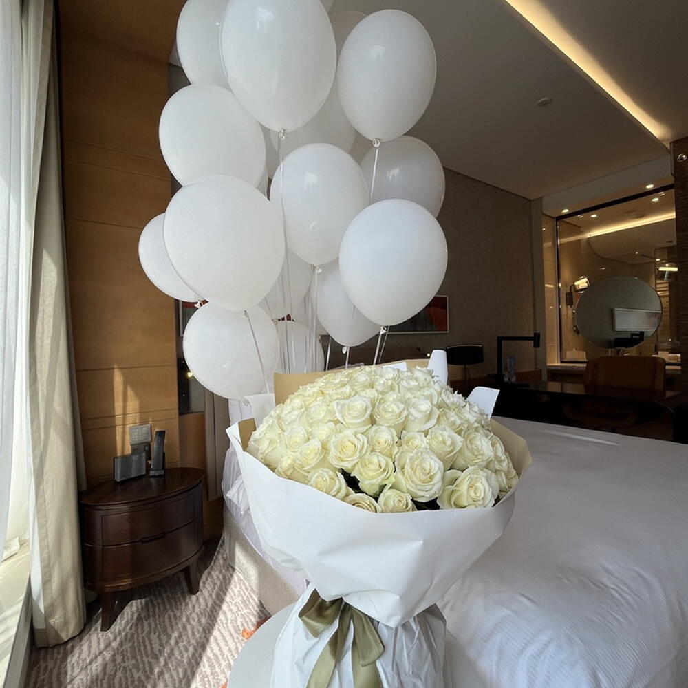 101 white roses "Rose in the Wind"+balloons