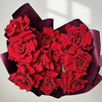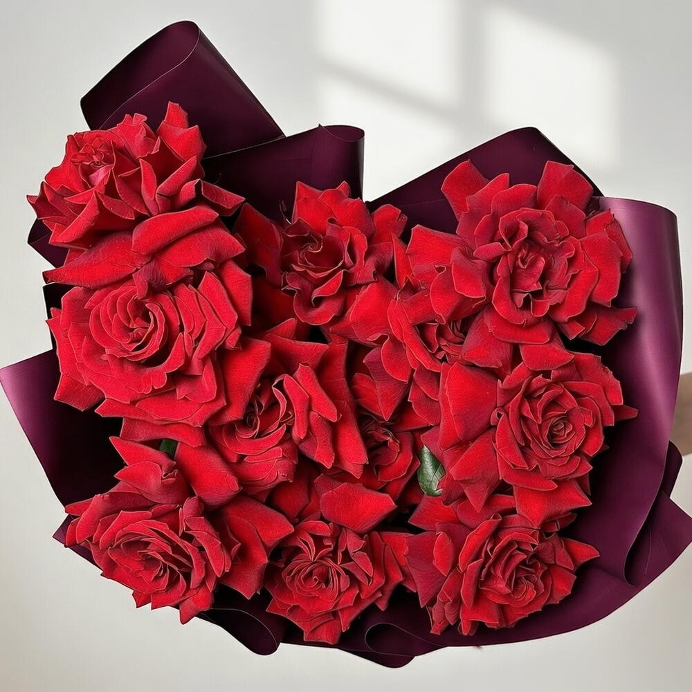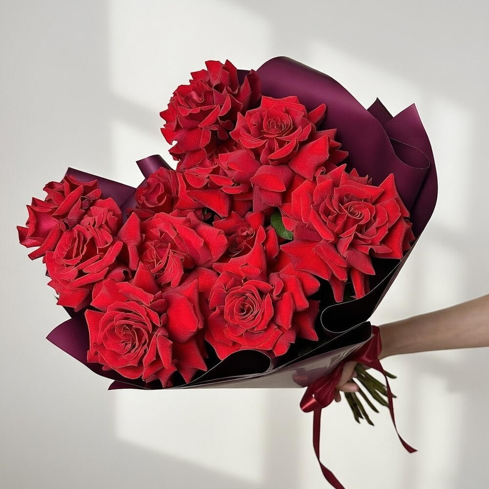 A compact yet expressive arrangement of eleven deep Bordeaux roses, admired for their full, peony-shaped blooms and rich scarlet tone. The bouquet is styled in elegant designer wrapping, creating a refined and modern presentation. With a height of approximately 55 cm and a width of 40 cm, the composition maintains a balanced, graceful shape while remaining easy to hold and gift. The roses are sourced from Ecuador, ensuring strong stems, large heads, and excellent freshness. Each bouquet is prepared with precision and care, focusing on quality, detail, and timely delivery. Details Height: 55 cm Width: 40 cm Weight: 1500 g Origin: Ecuador Suitable for Girlfriend · Wife · Woman · Mother · Man Birthday · Valentine’s Day · Anniversary · Jubilee · Family celebration · Engagement · Sympathy · Romantic surprise A timeless floral gesture designed to convey depth, admiration, and heartfelt emotion.