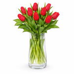 11 Red Tulips Prepared in a glass vase Finished with a ribbon bow